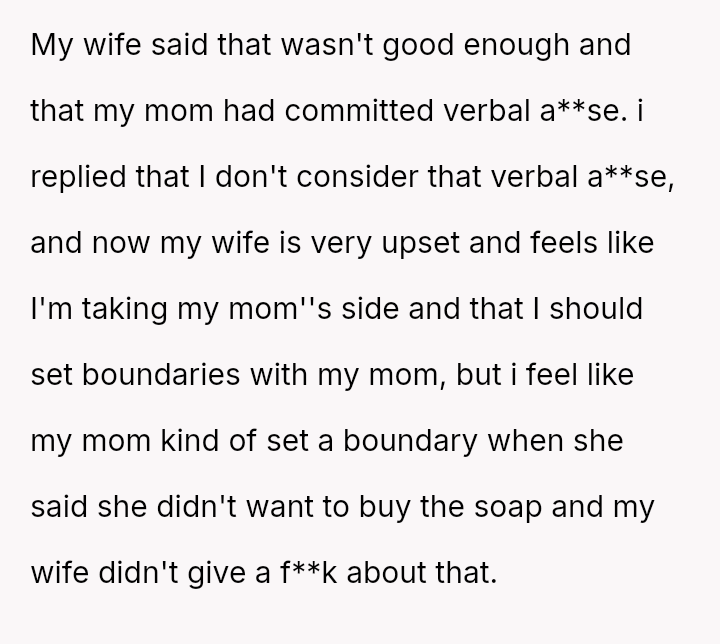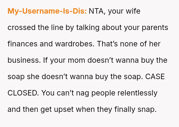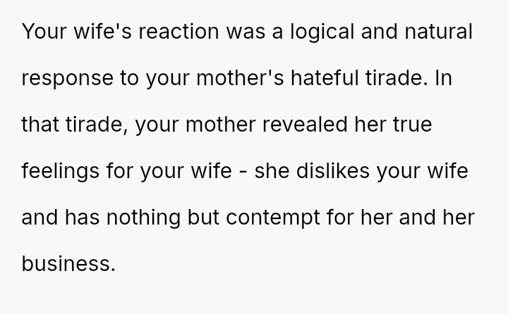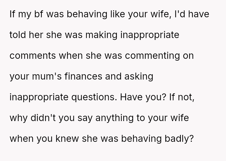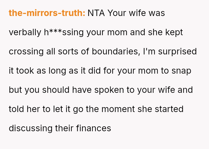 Was the mother's angry outburst a justified response to persistent boundary v***ation and invasive financial comments, or did the wife's actions, while pushy, warrant the OP's intervention against his mother for perceived verbal a**se?