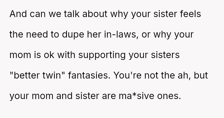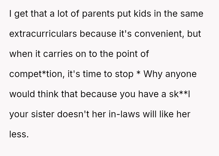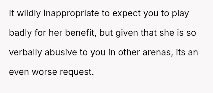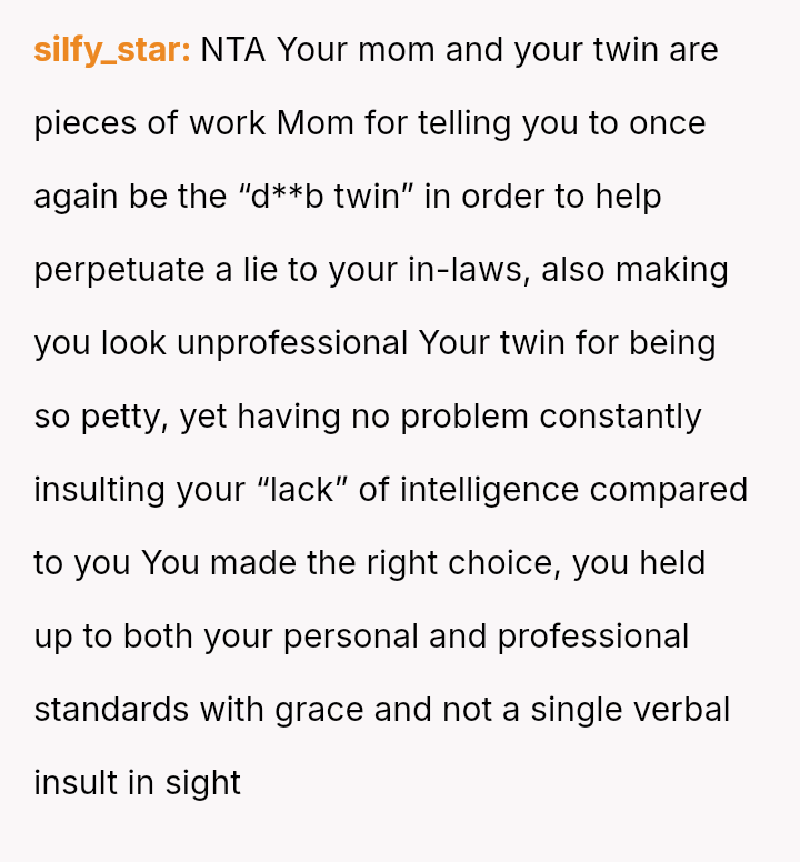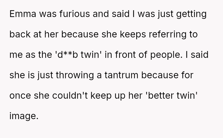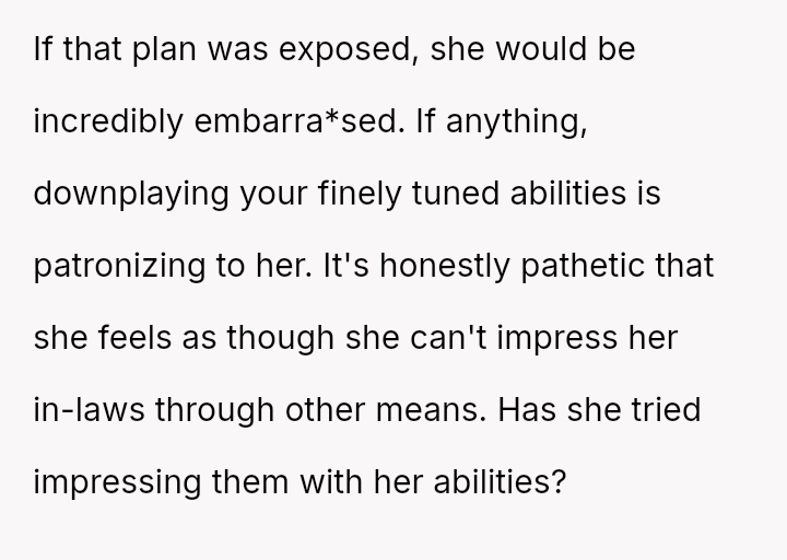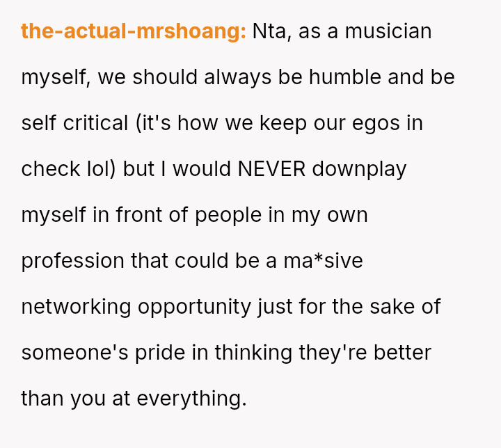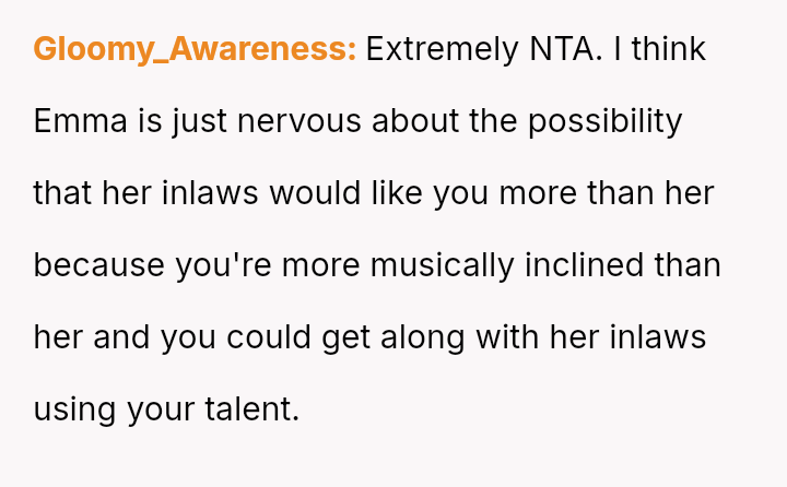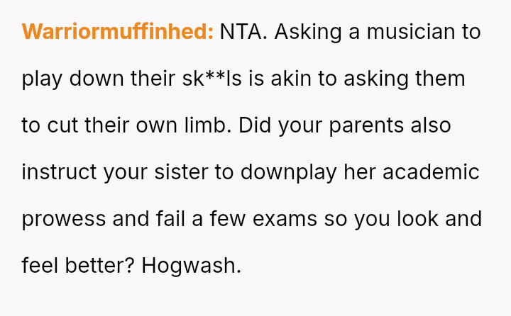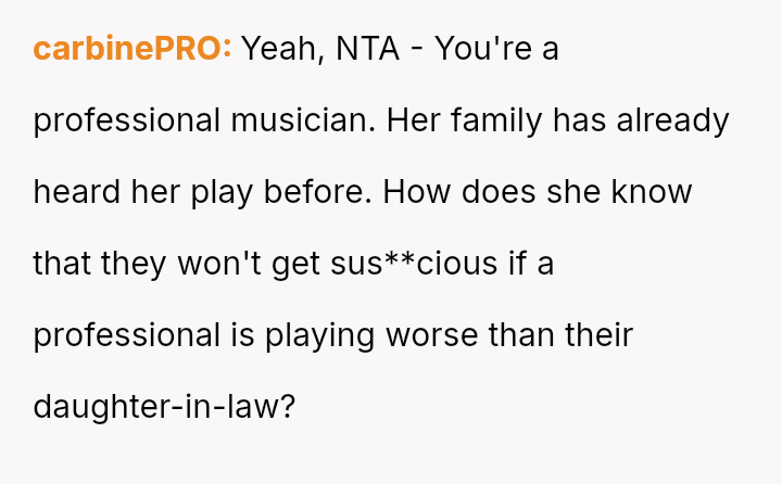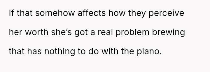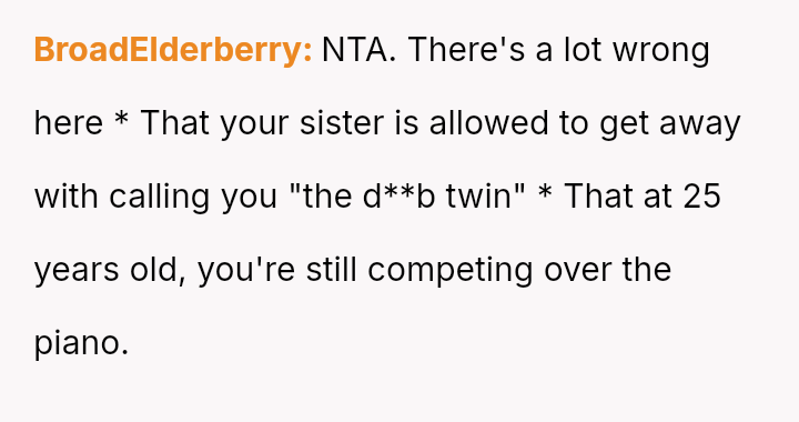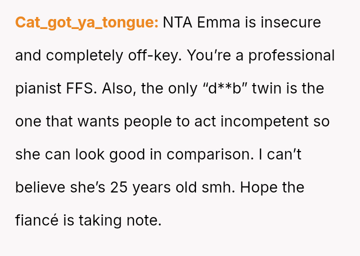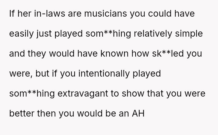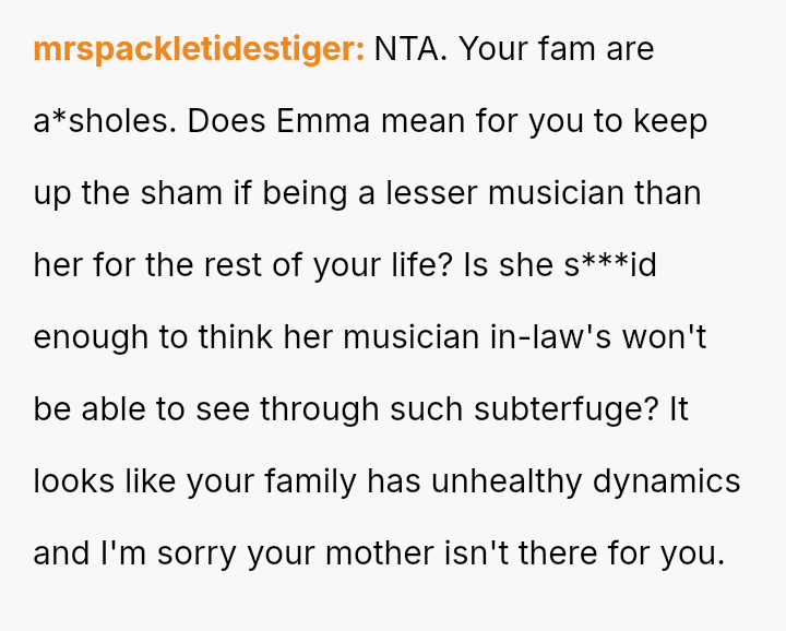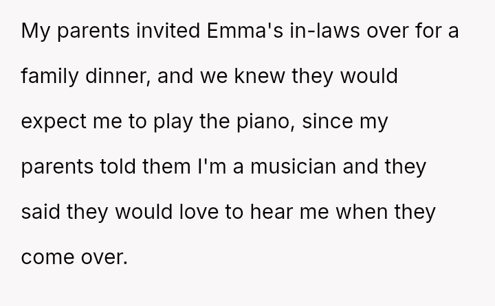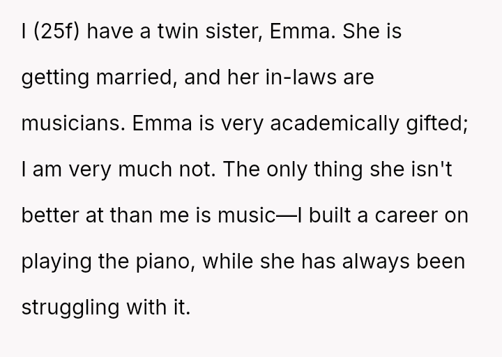 The Original Poster (OP) is experiencing conflict stemming from a request by their twin sister, Emma, to intentionally underperform on the piano during a family dinner to protect Emma's image in front of her in-laws.