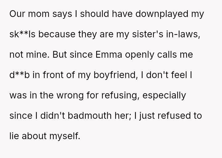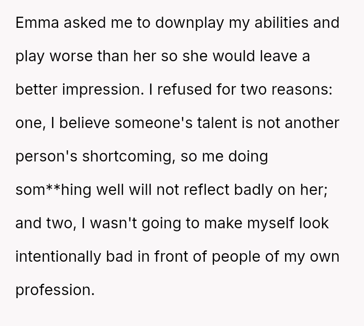 The OP stood by their professional integrity and refused to fake incompetence, leading to an accusation from Emma that the refusal was payback for past insults regarding the OP's intelligence.