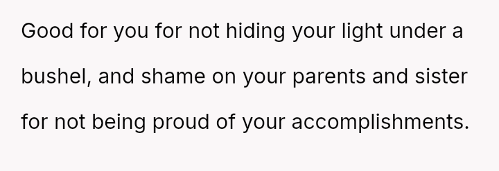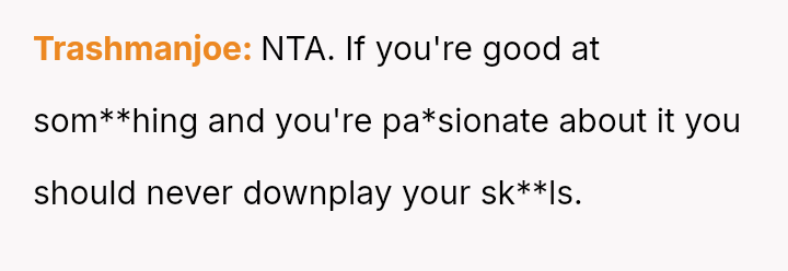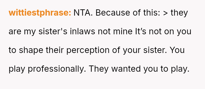 The central debate is whether the OP was obligated to diminish their professional talent to support their sister's social standing with her in-laws, or if maintaining personal and professional authenticity outweighs this obligation, especially given the sister's history of belittling the OP.