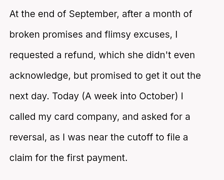 The central conflict arose when the seller repeatedly failed to uphold her commitment to ship the item, escalating from broken promises to excuses, which ultimately forced the OP to abandon the purchase and seek a charge reversal.