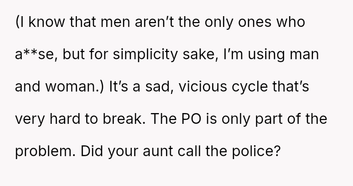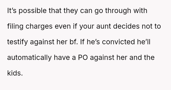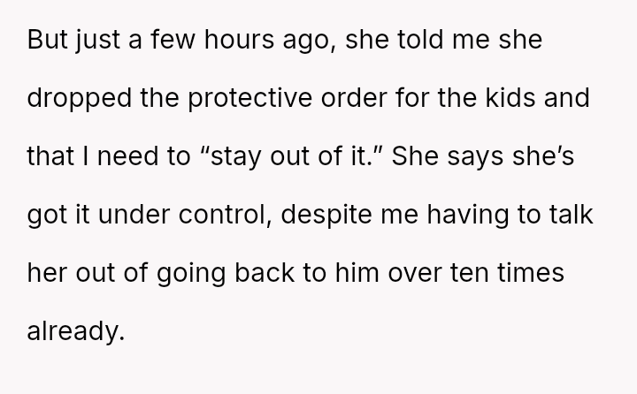 The central conflict arises because the OP's necessary, protective actions—supporting the legal restraining order and maintaining safety boundaries—directly clash with the aunt's immediate decision to drop the protective order and demand the OP cease involvement, suggesting she may be reverting to the cycle of a**se.