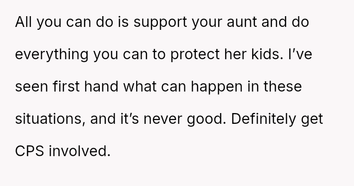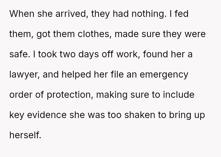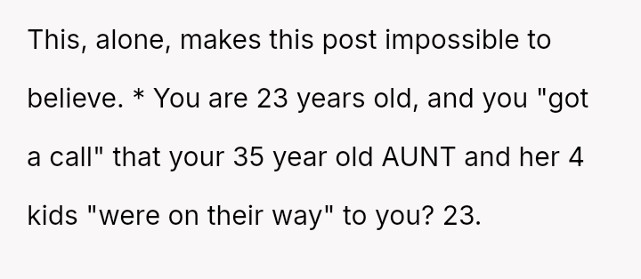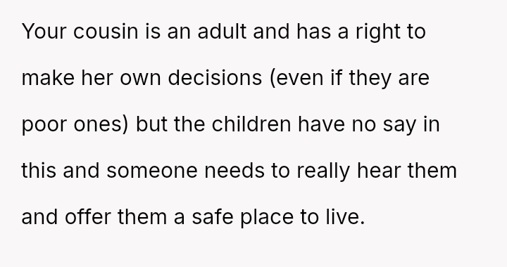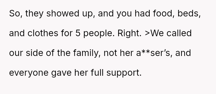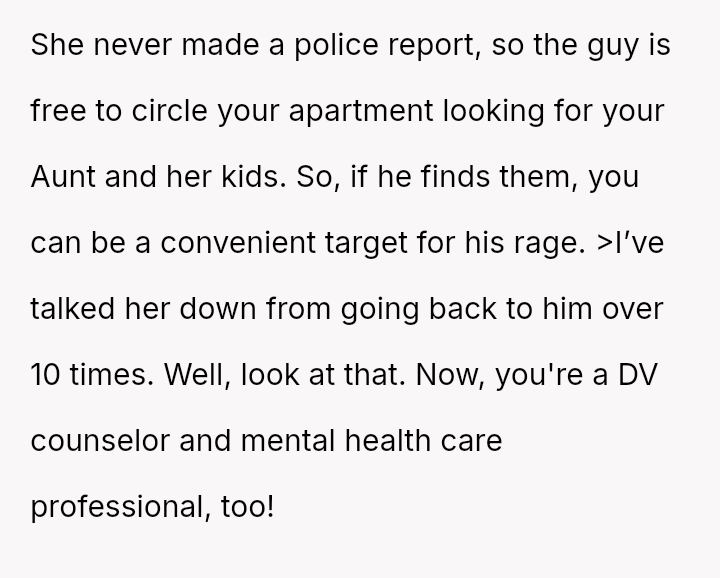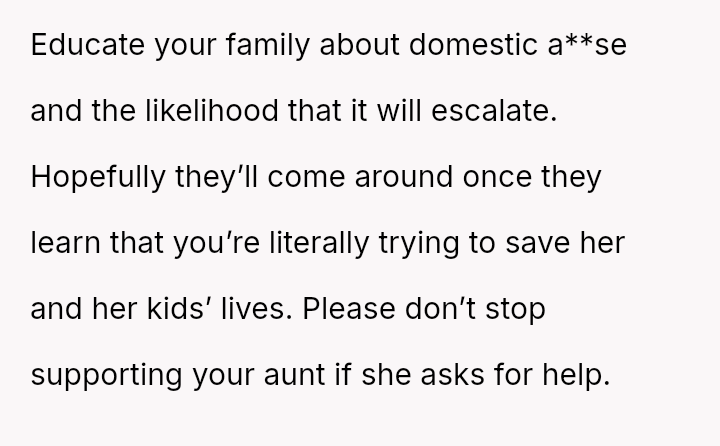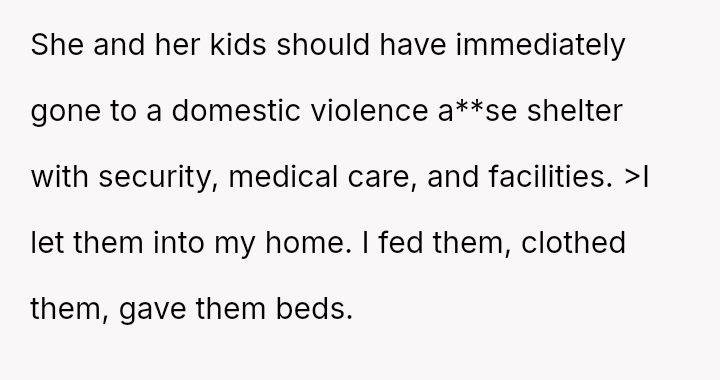 The original poster (OP) acted with significant generosity and courage, providing immediate shelter and comprehensive support to their aunt and four young children fleeing a violent domestic situation.