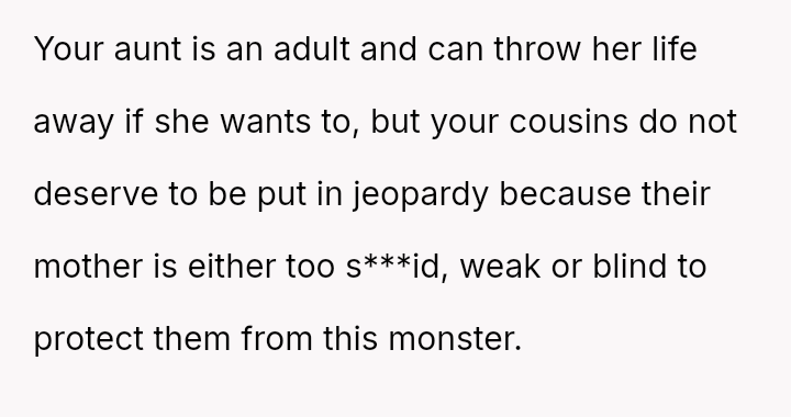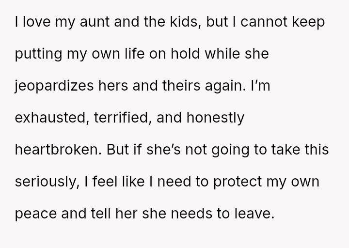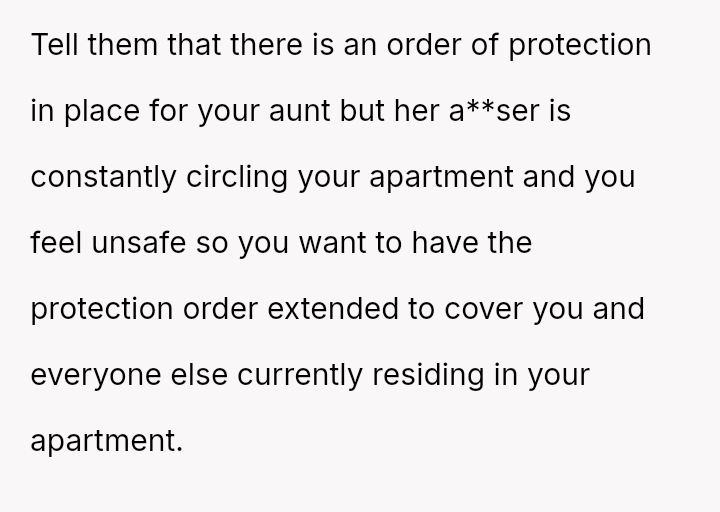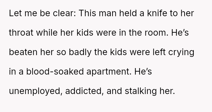 Given the demonstrable, severe danger the ex-partner poses, is the OP justified in prioritizing the safety of the children and themselves by demanding the aunt and her children leave the OP's apartment now that the protective legal steps have been voluntarily abandoned by the aunt?