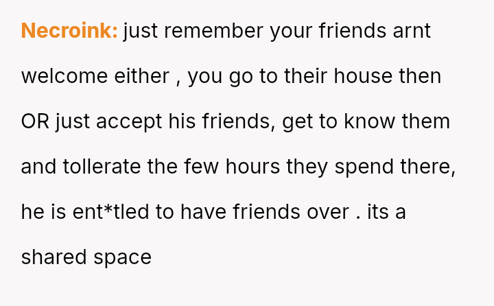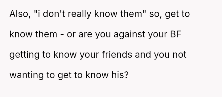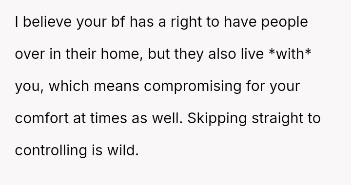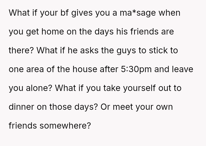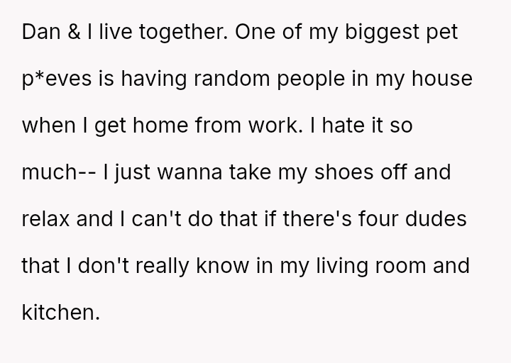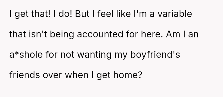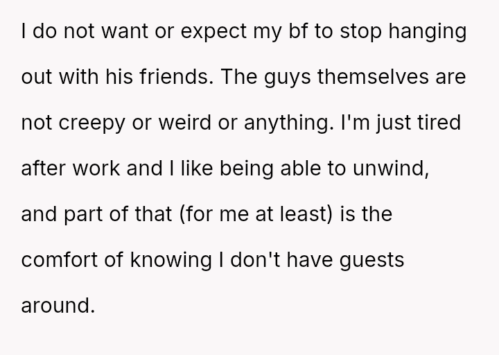 The original poster is clearly conflicted, feeling a strong need for personal space and decompression time after work which conflicts directly with her boyfriend's es**blished social routine with his friends in their shared home.