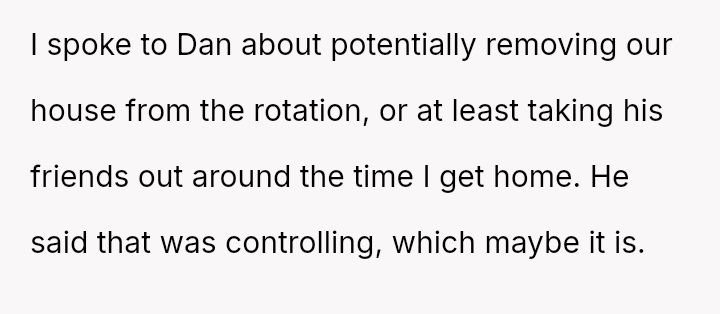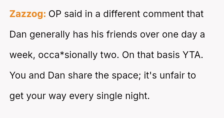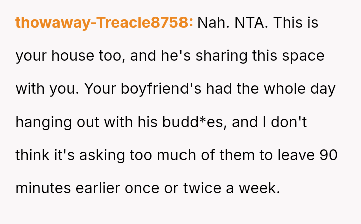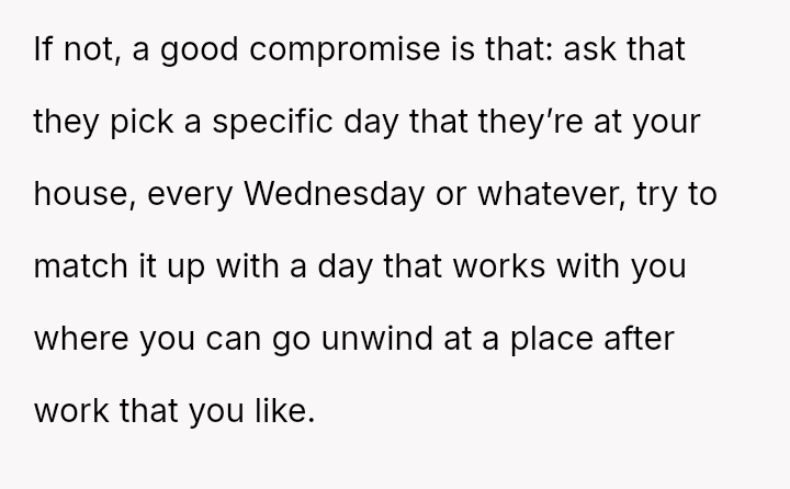 Is the original poster being unreasonable by prioritizing her need for a quiet, guest-free home environment immediately after work, or is the boyfriend justified in viewing her request to alter the es**blished social schedule as controlling and unfair to his friends?
