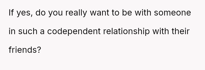 Caught between understanding her partner’s loyalty to his friends and her own need for personal space, she faces an emotional tug-of-war.