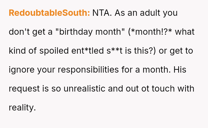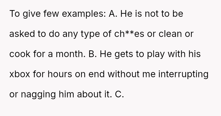 The original poster (OP) is facing a significant conflict arising from her husband's extensive and unilateral list of demands for his 30th birthday month, which seeks a complete abdication of his household and parental responsibilities.