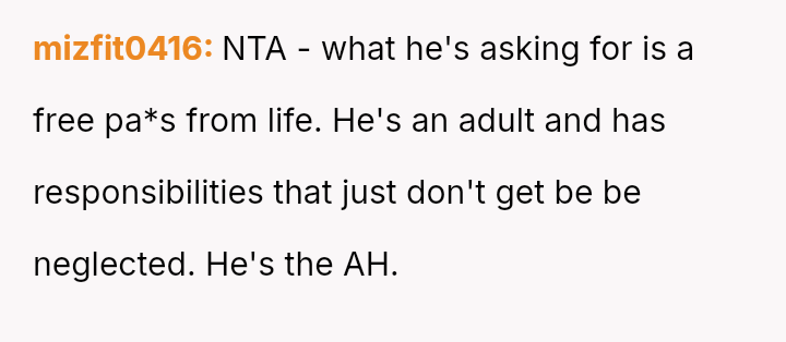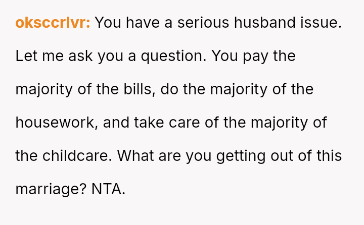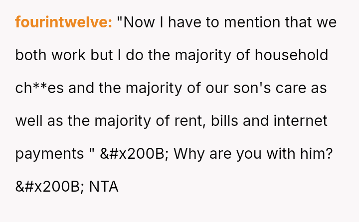 The OP correctly identified these expectations as unreasonable, especially given that she already shoulders the majority of the domestic and financial load, making his request unsustainable.