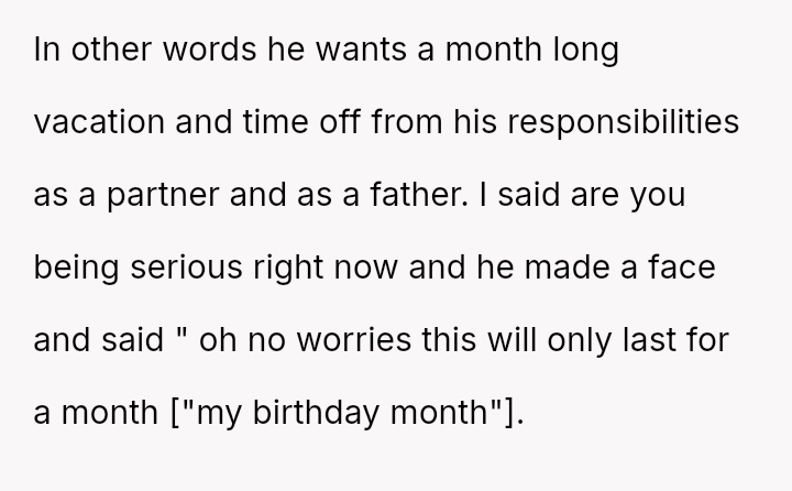 His list of “birthday month expectations” laid bare a desire to escape the roles of husband and father, craving a reprieve that felt more like a vacation than a celebration. But for her, the reality hit like a storm.