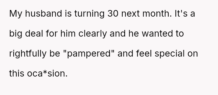 Given the disparity between the husband's expectations—a month of luxurious, responsibility-free living—and the reality of their shared financial and parental duties, should the OP strictly adhere to her refusal of the demands, or is there a middle ground where she can acknowledge his milestone without sacrificing her essential role in managing their family life?