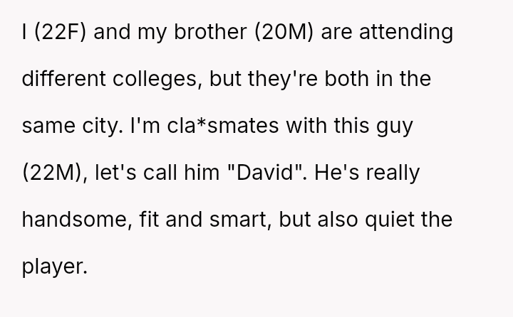 David, the enigmatic and notorious charmer known for his countless conquests, unexpectedly becomes the heartthrob of her younger brother, turning the sister’s world upside down.