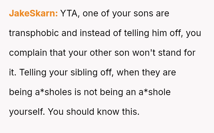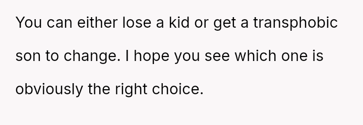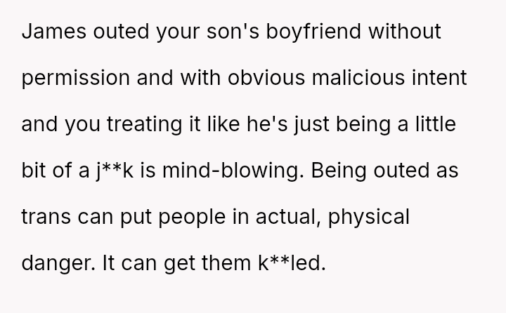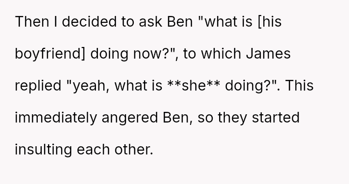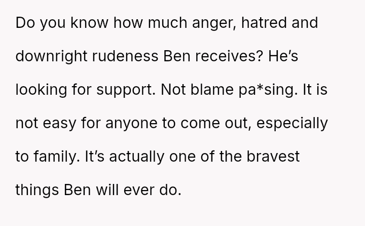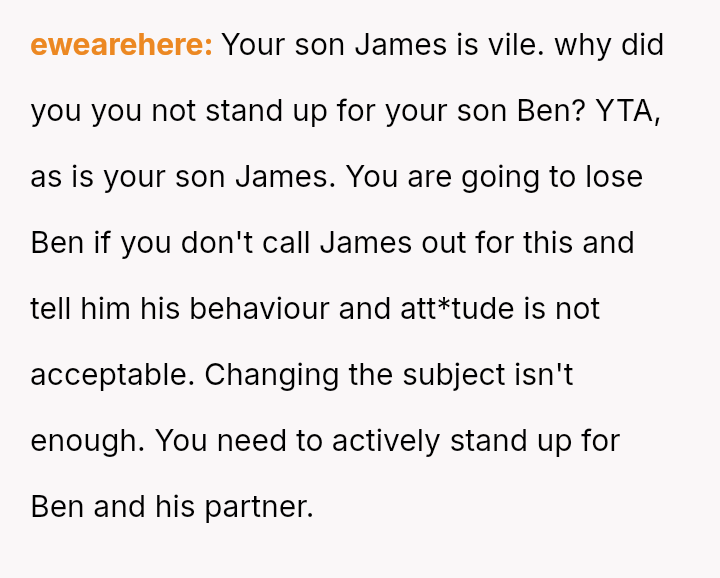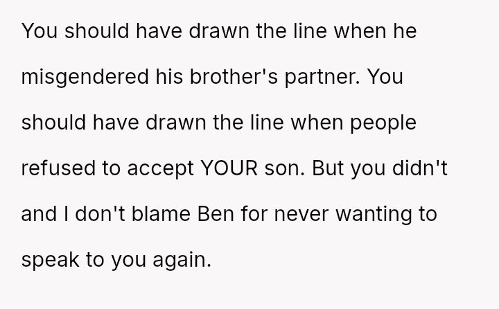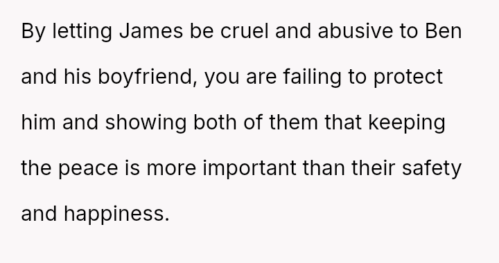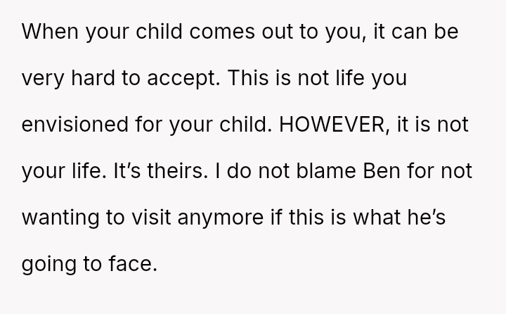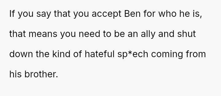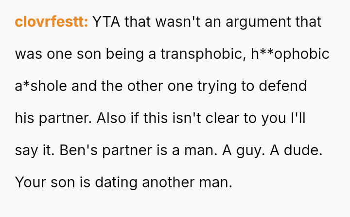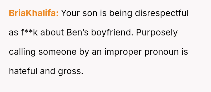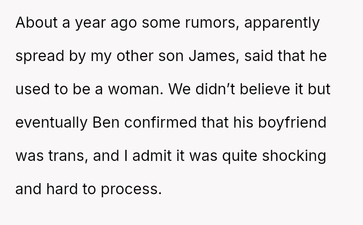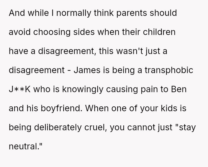 The parent finds themselves caught in a severe conflict between their two sons, Ben and James, following James's deliberate misgendering of Ben's transgender boyfriend.