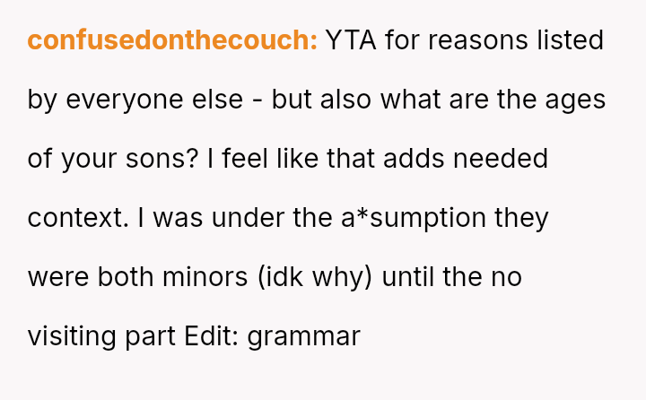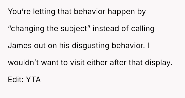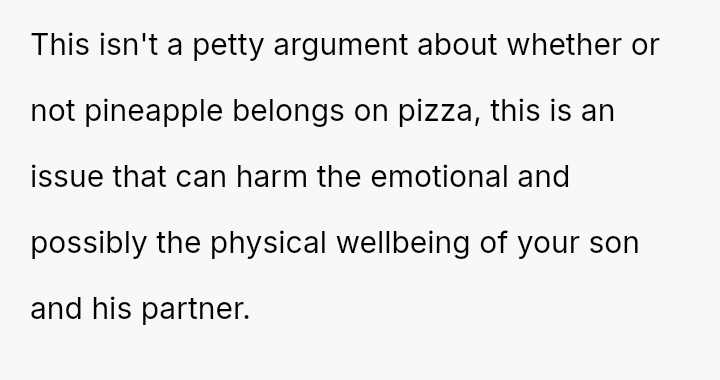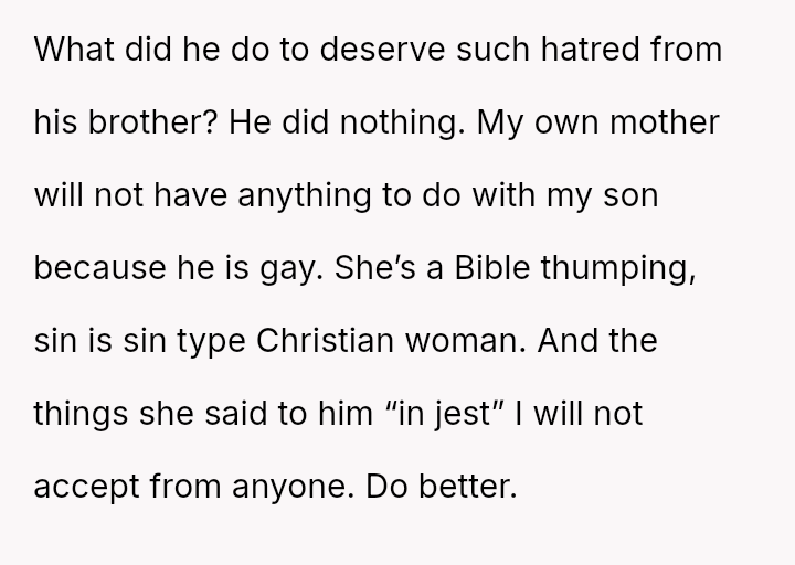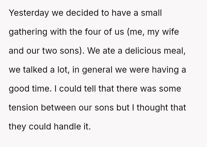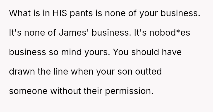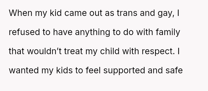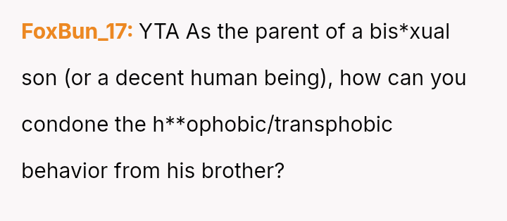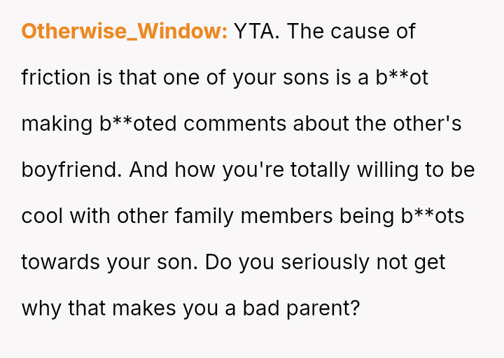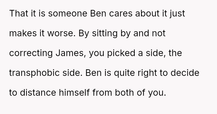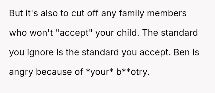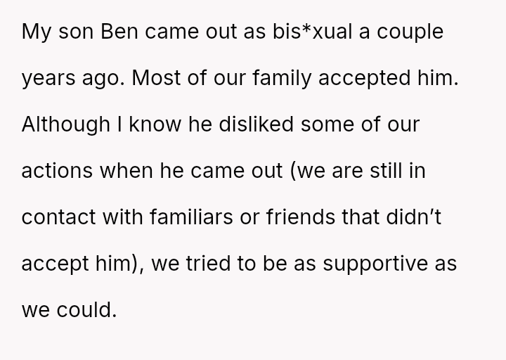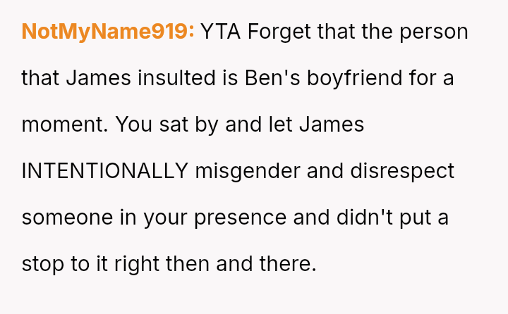 The parent finds themselves caught in a severe conflict between their two sons, Ben and James, following James's deliberate misgendering of Ben's transgender boyfriend.