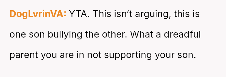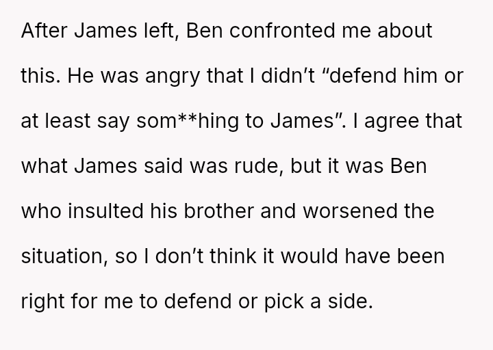 While the parent acknowledges James's comment was rude, they believe Ben escalated the situation by insulting his brother, leading the parent to adopt a neutral stance to de-escalate.