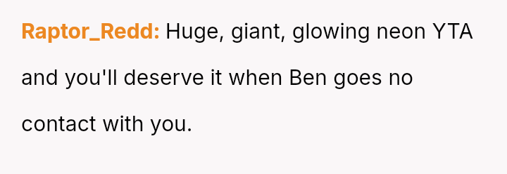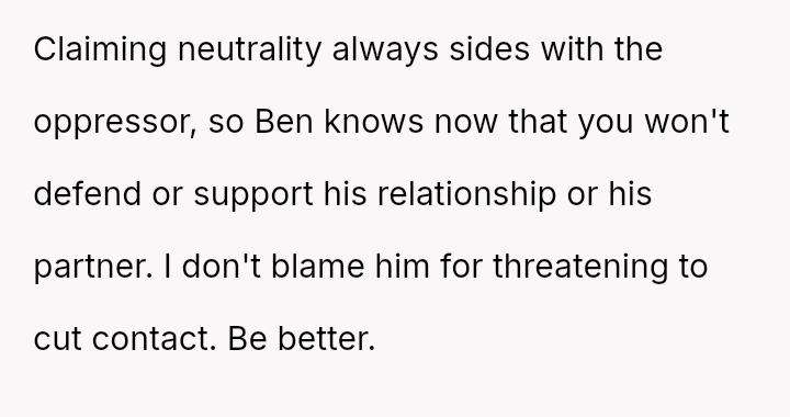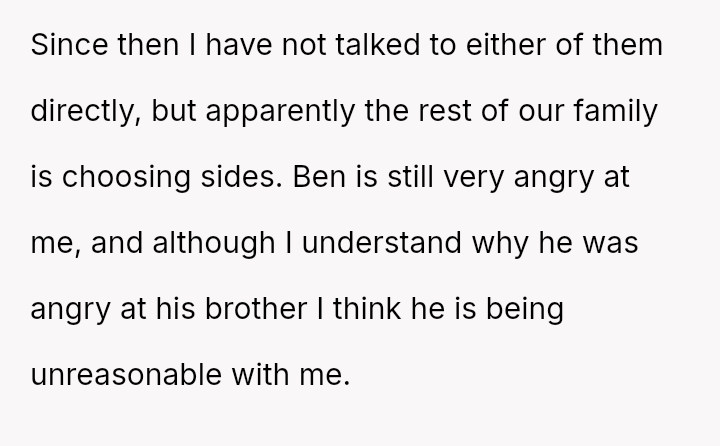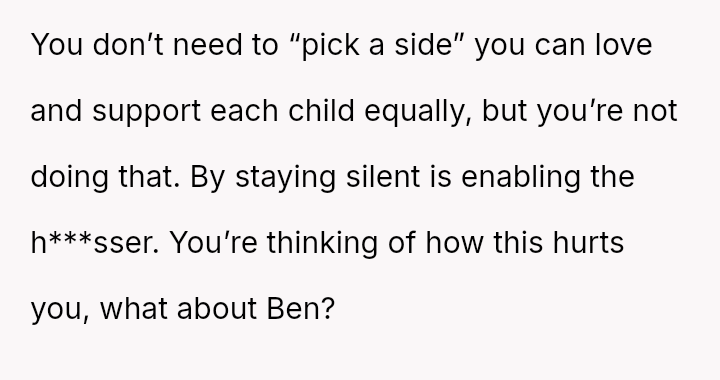 This neutrality, however, has caused Ben to issue an ultimatum, threatening to cease contact unless the parent actively sides against James, placing the parent in an emotionally painful position between their children.