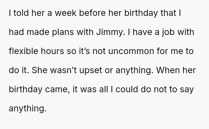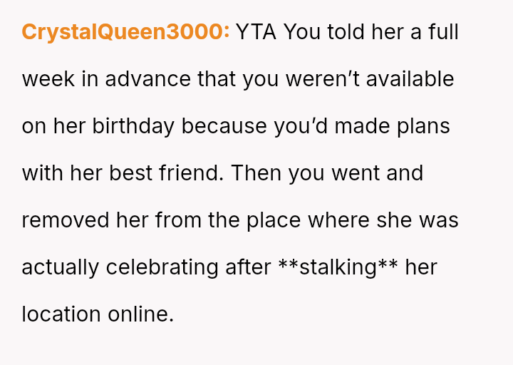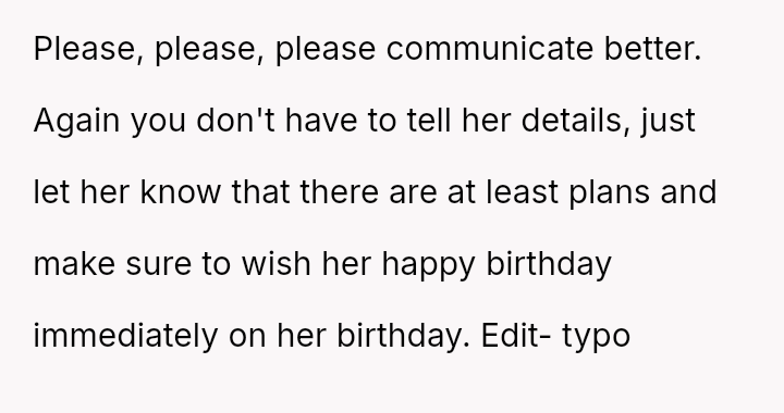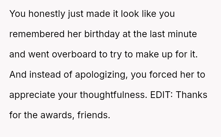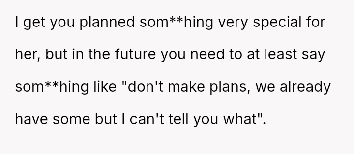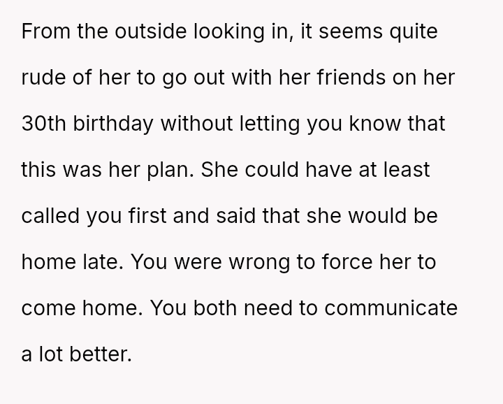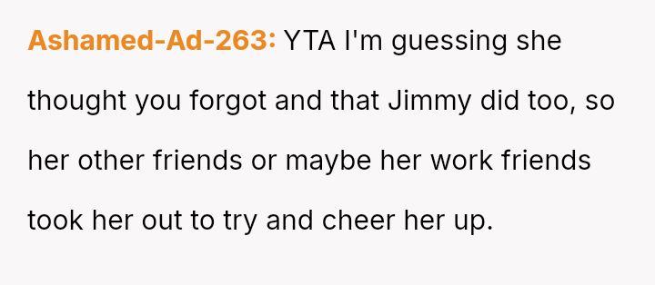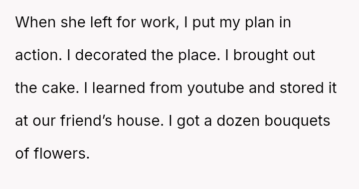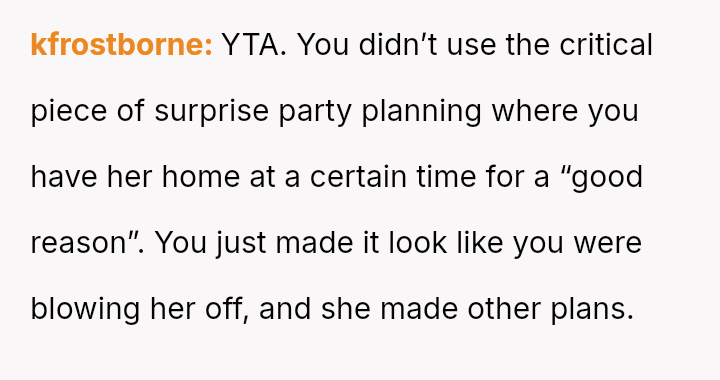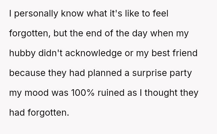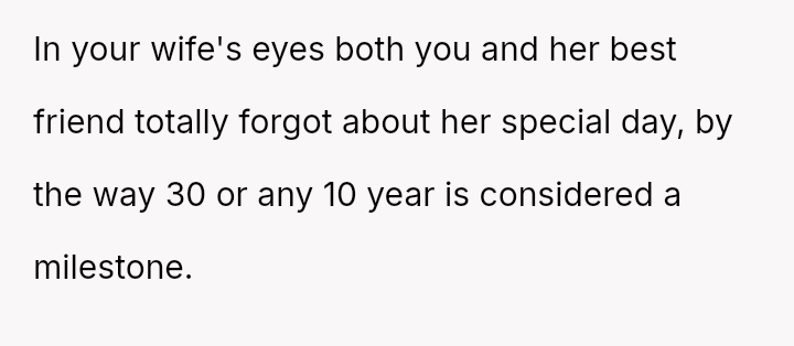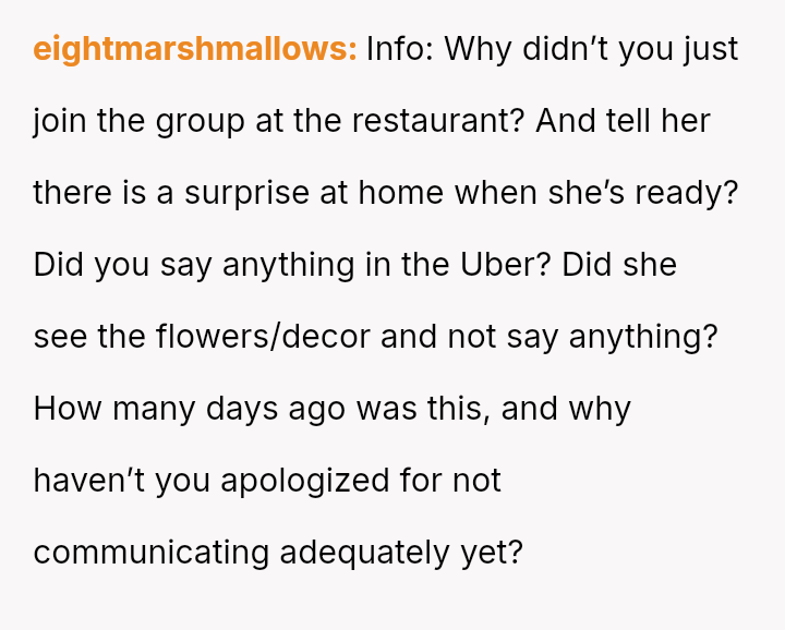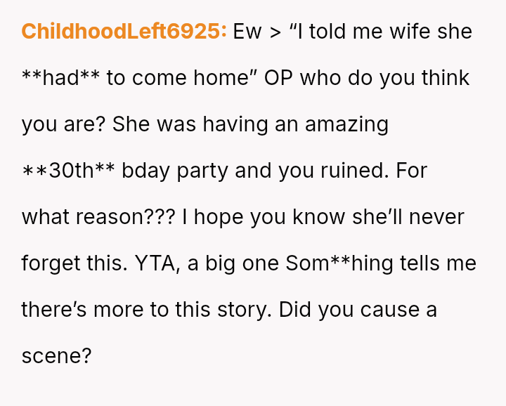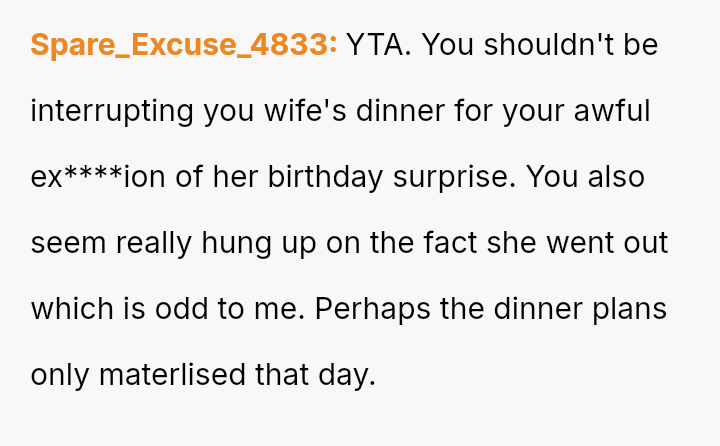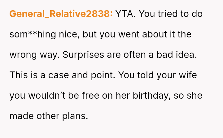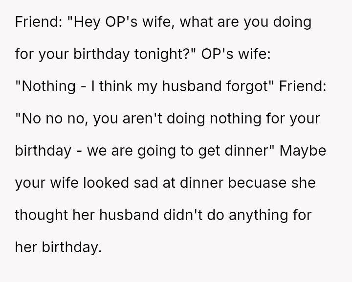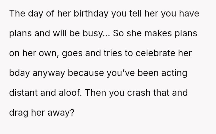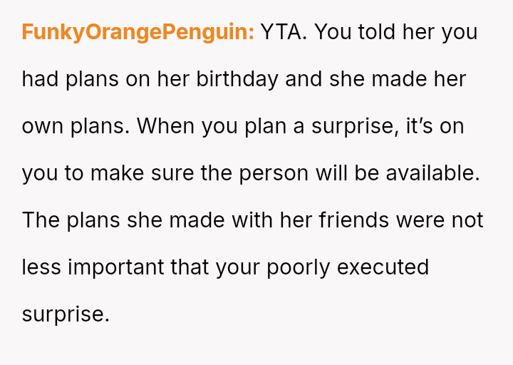 However, his actions led to his wife feeling ignored, resulting in her making alternate plans with her own friends, which culminated in a confrontation when the OP demanded she leave her celebration to return home for his surprise.