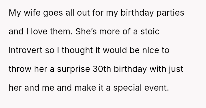 The original poster (OP) clearly intended to show deep affection by organizing an elaborate surprise celebration for his wife's 30th birthday, involving secrecy and significant effort related to a personal gift made with her best friend.