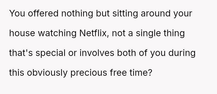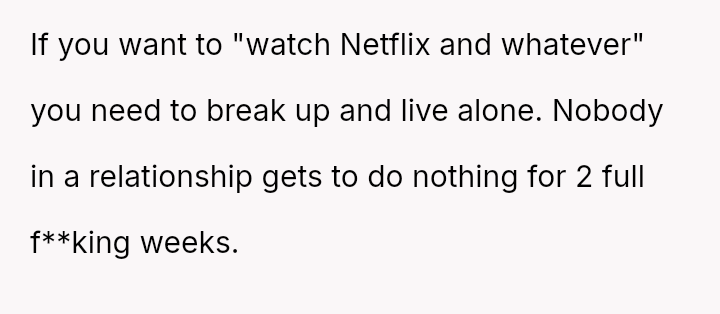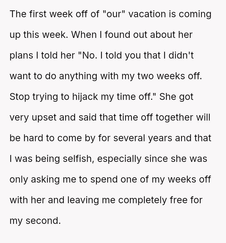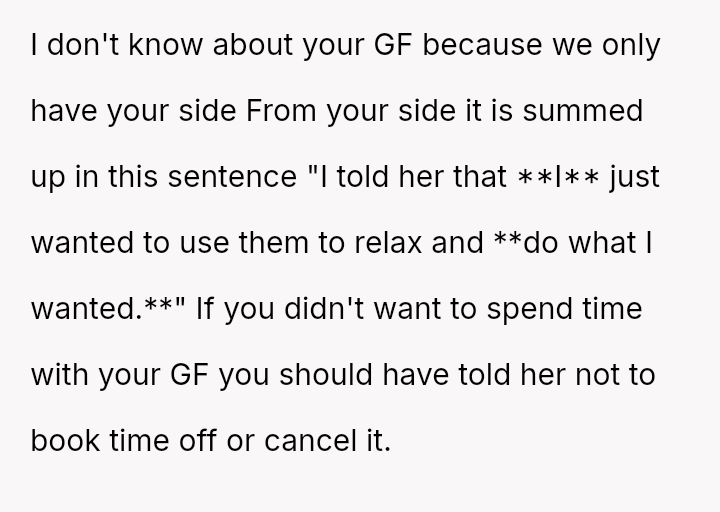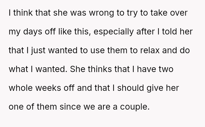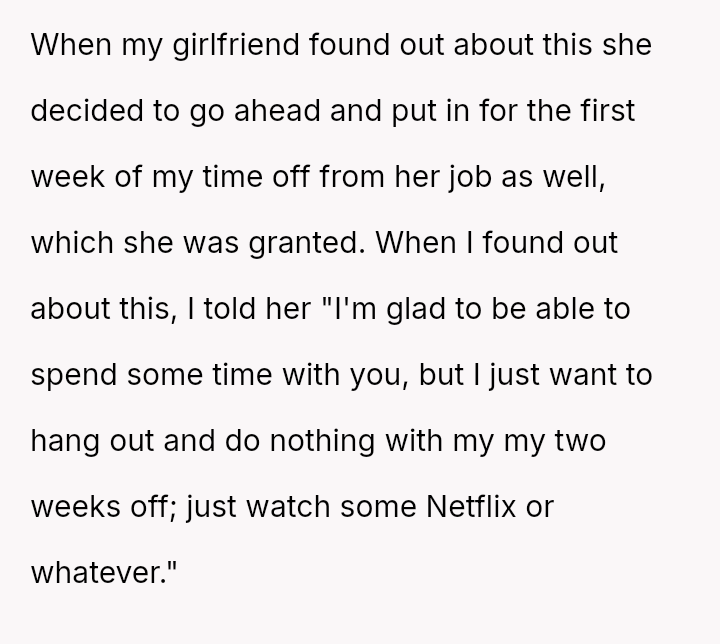 Was the OP justified in firmly rejecting his girlfriend's plans after explicitly stating his desire to do nothing, or did his girlfriend have a reasonable expectation of sharing at least a portion of the time off given their relationship status? Where should the balance lie between individual needs for rest and shared relational time?