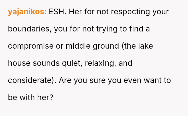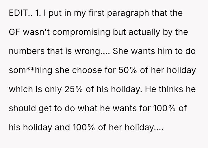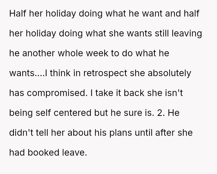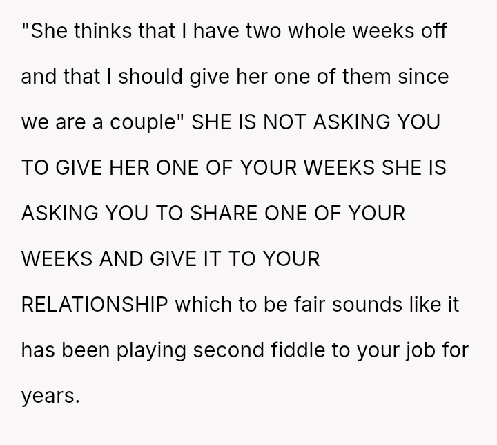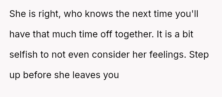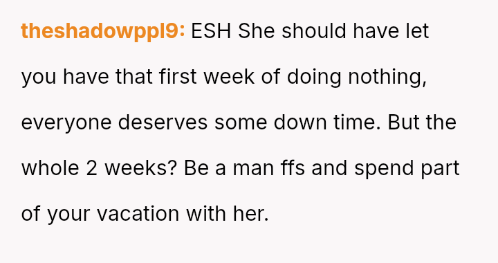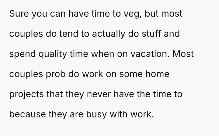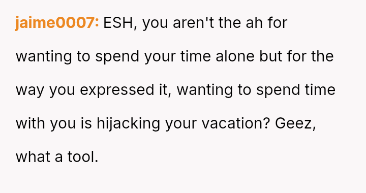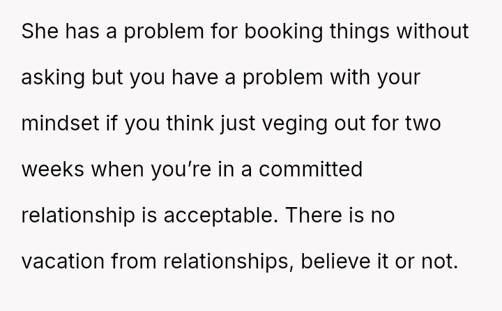 The central disagreement is between the OP's need for solitary decompression and the girlfriend's expectation of shared quality time built into their combined vacation period.