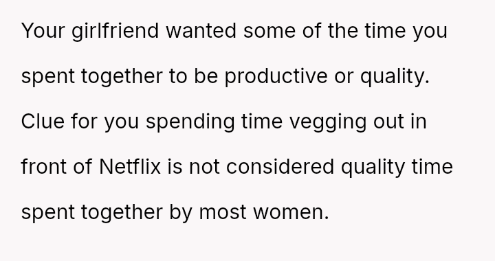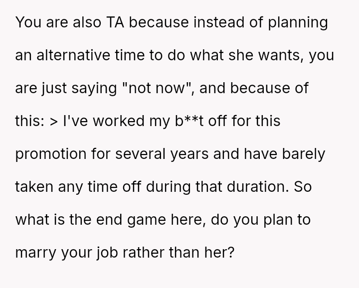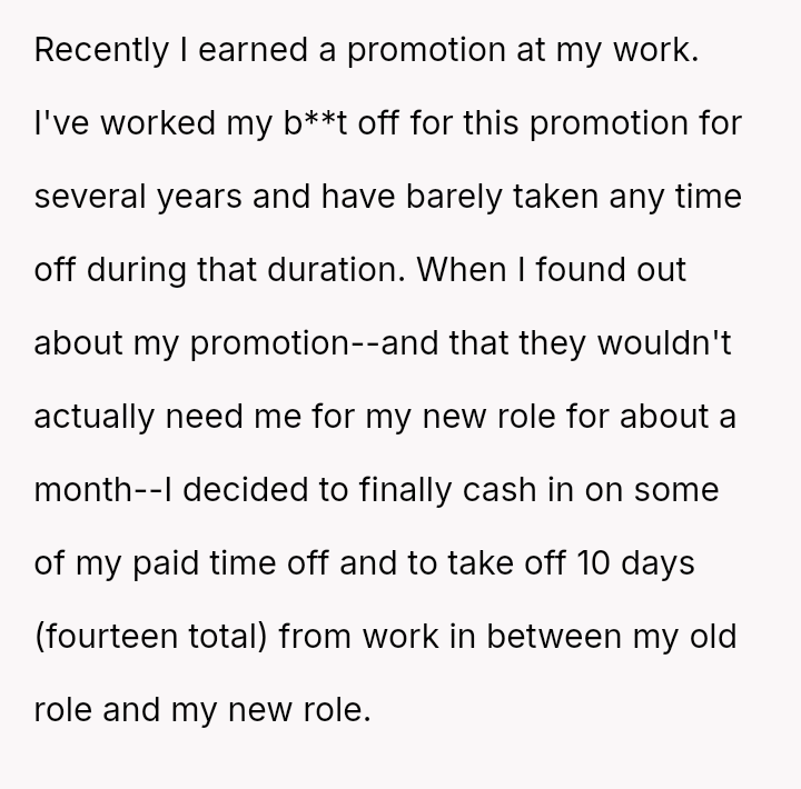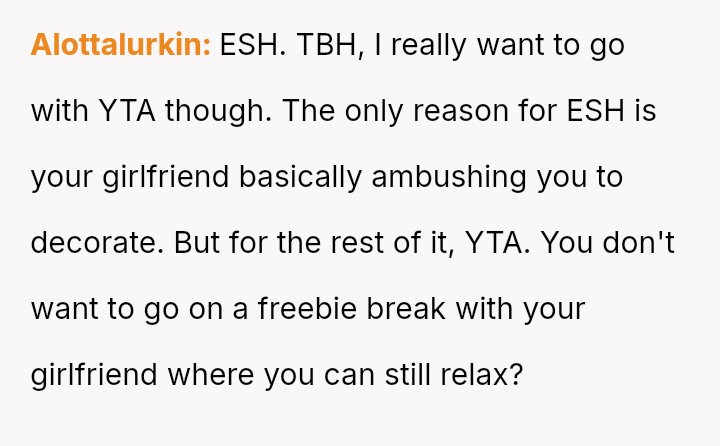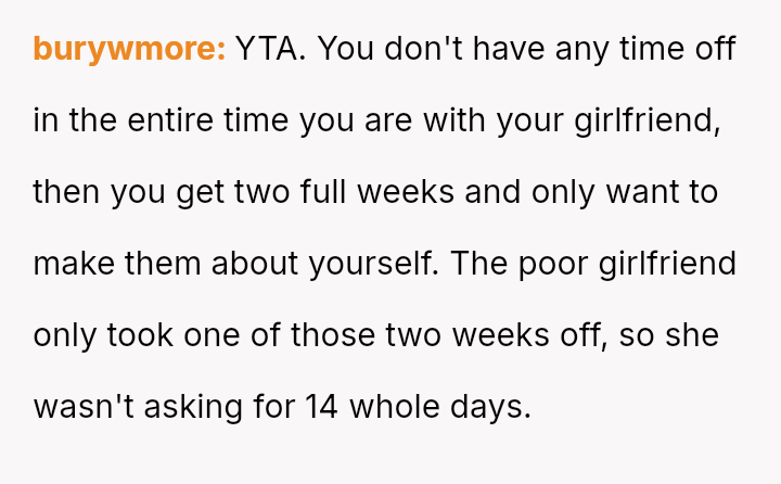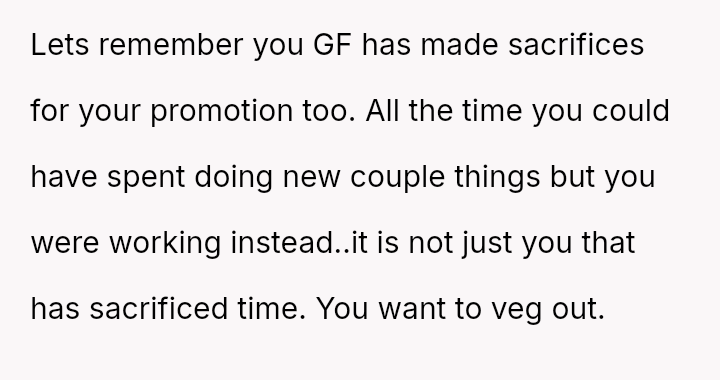 The original poster (OP) prioritized intense personal rest and relaxation after a significant career achievement, leading to a conflict when his girlfriend planned joint activities, viewing the time off as an opportunity for couple engagement.