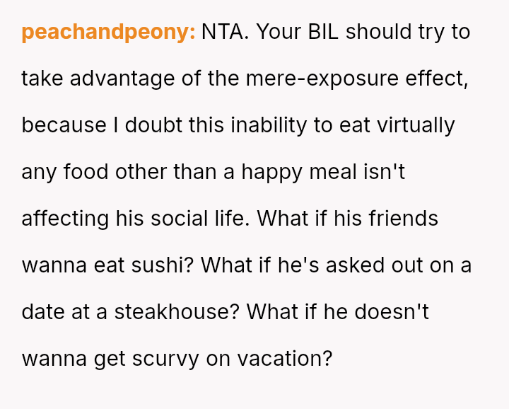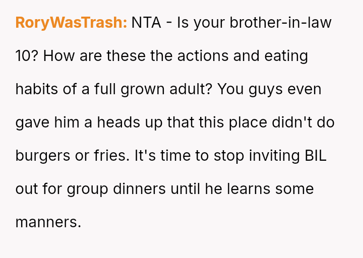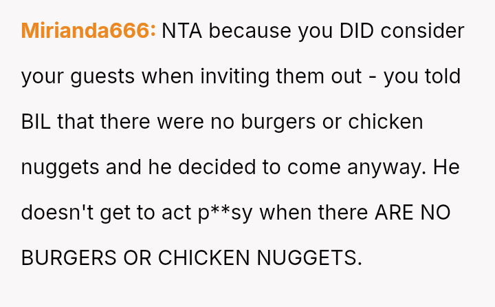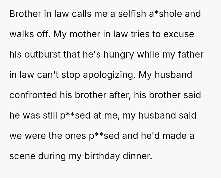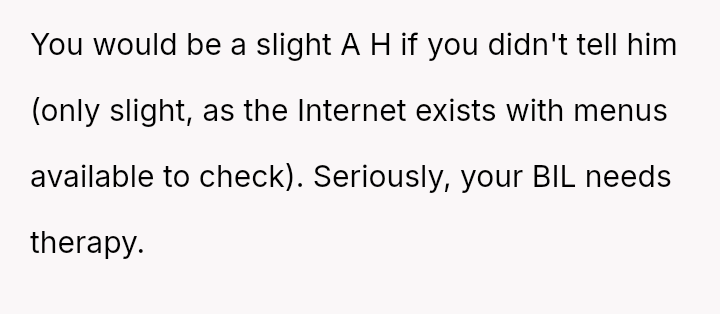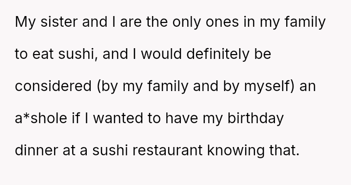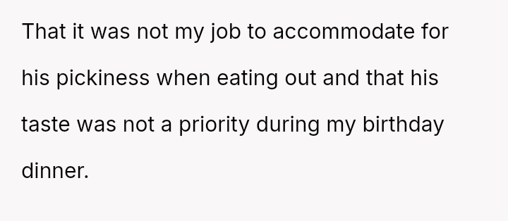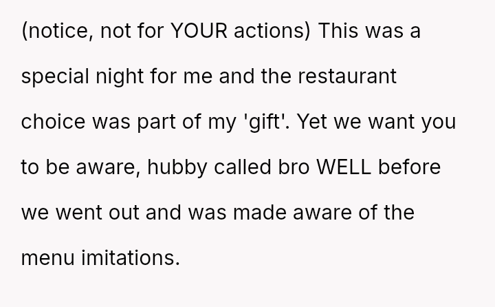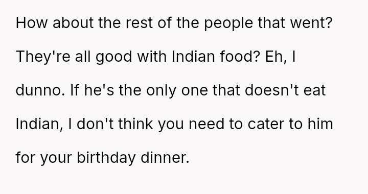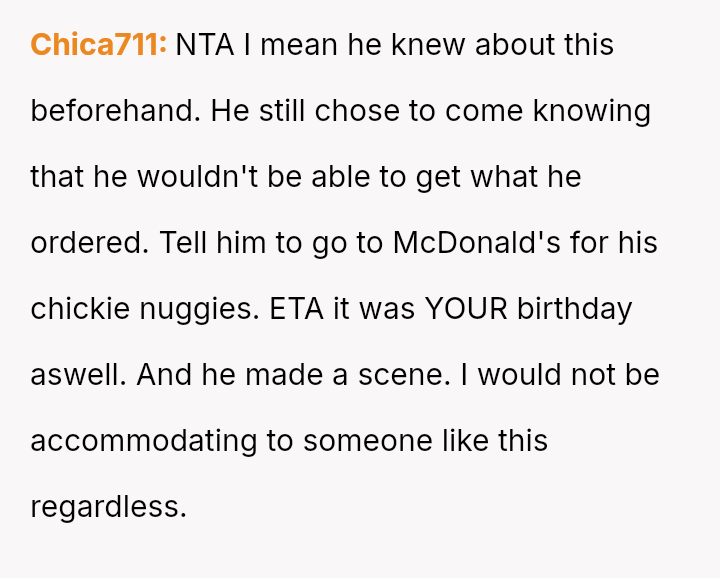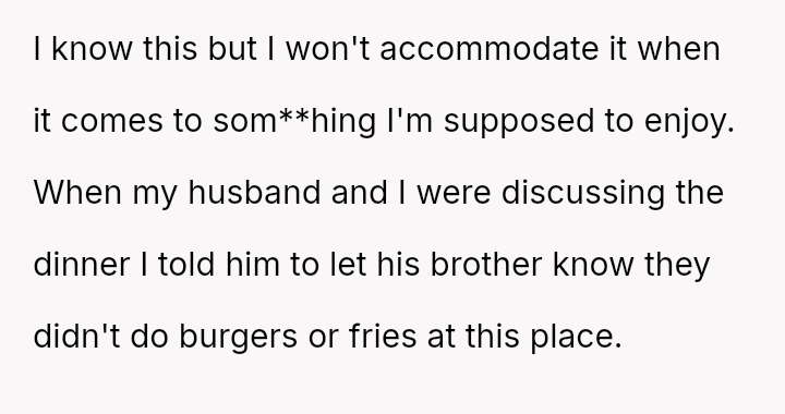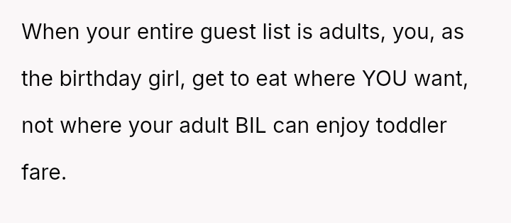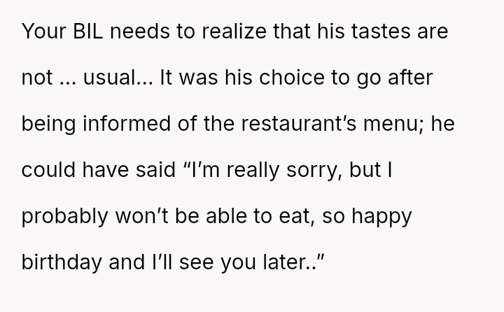 The original poster (OP) experienced a conflict where her brother-in-law (BIL) demanded specific, limited food options at her birthday dinner, leading to an outburst when those options were unavailable.
