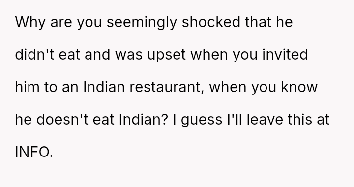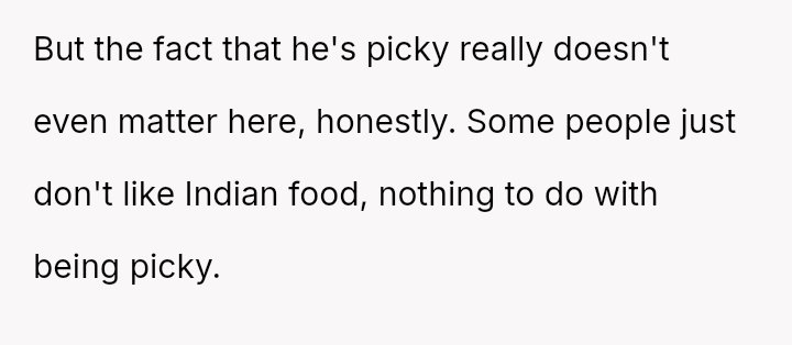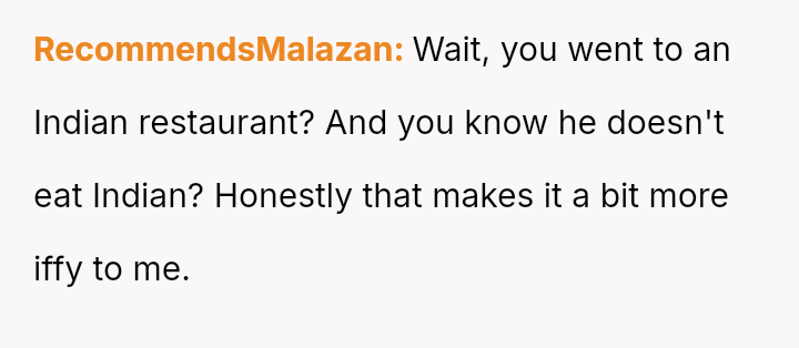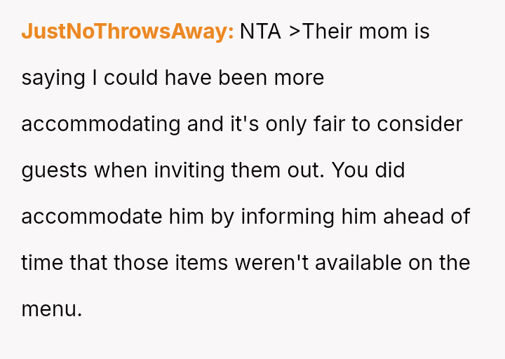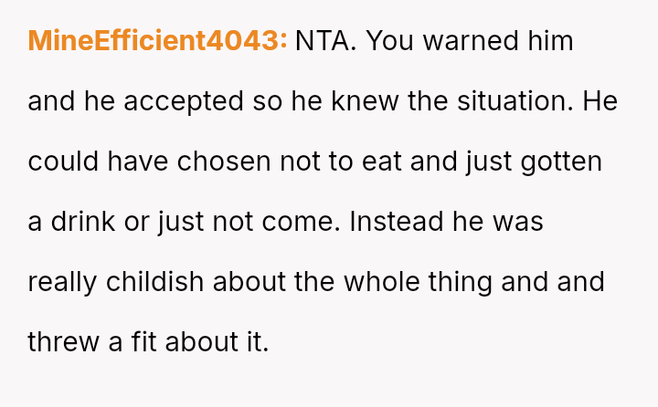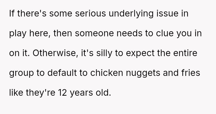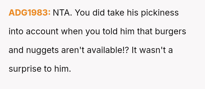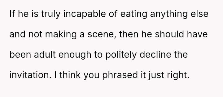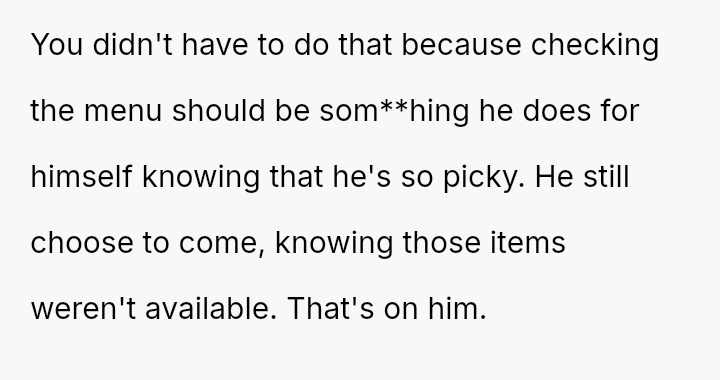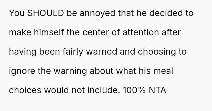 As everyone else engaged in the shared experience of choosing and enjoying their meals, his stubborn refusal to adapt became a symbol of disregard, not just for the menu, but for her special day.