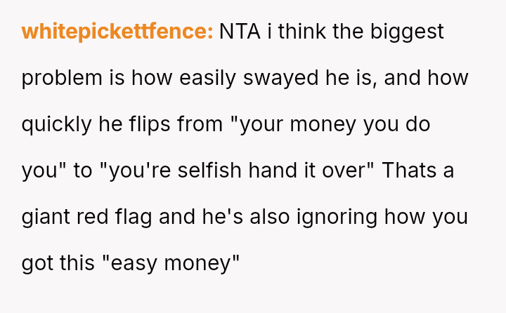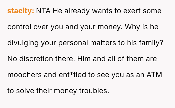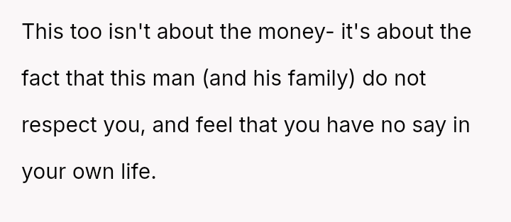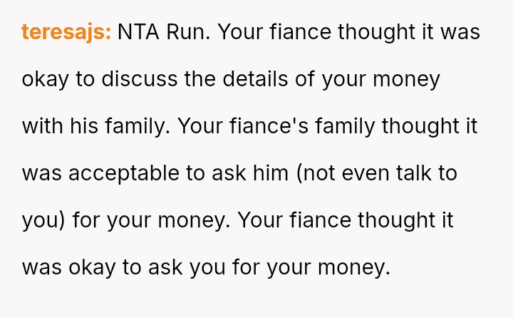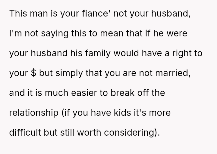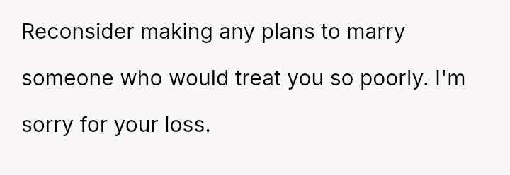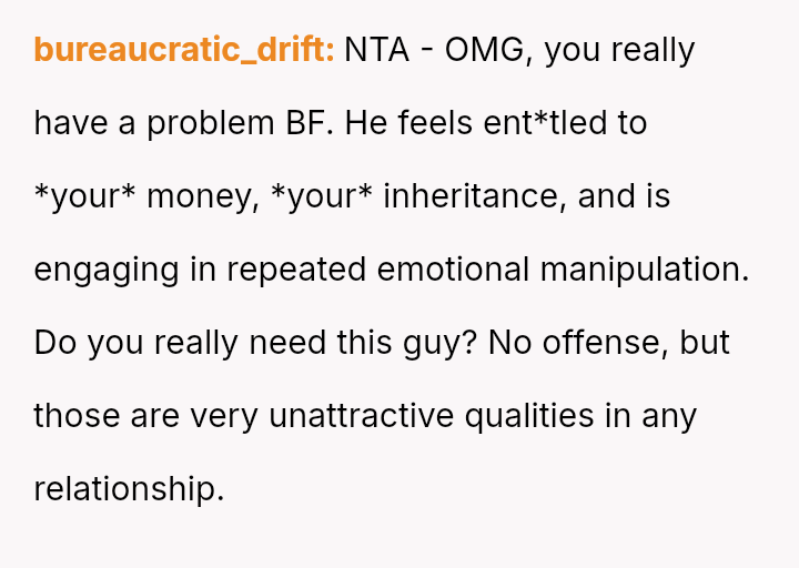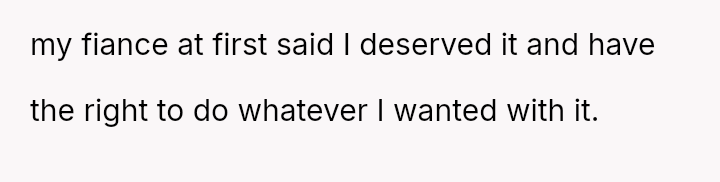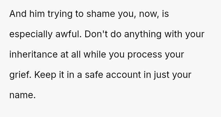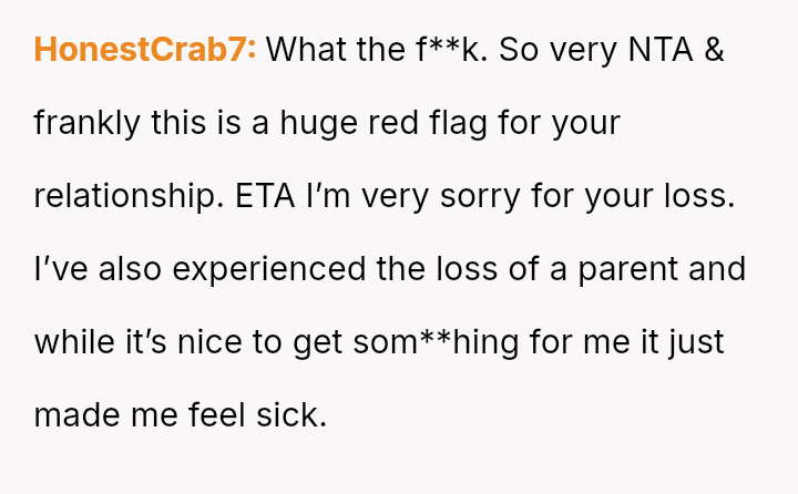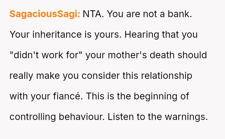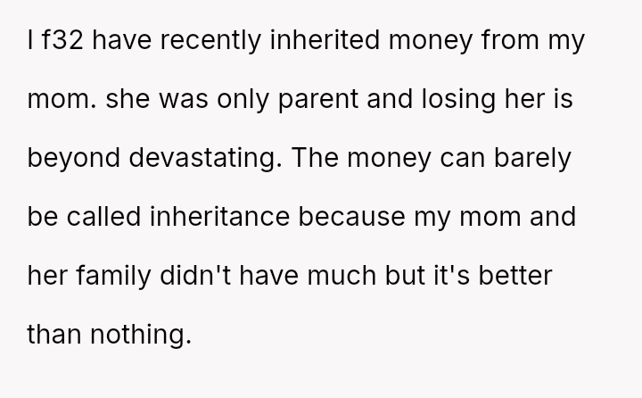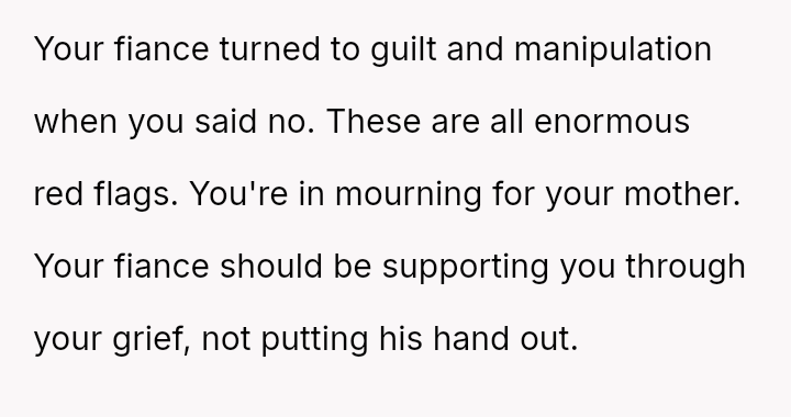 The original poster is facing significant emotional distress due to the recent loss of their mother and the subsequent financial inheritance, which has become a point of conflict with their fiancé.