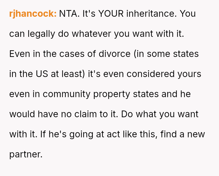 Is the fiancé justified in pressuring his partner to use her private inheritance for his family's medical needs, especially after initial agreement, or does the OP have absolute autonomy over funds inherited from a deceased parent, regardless of the family's requests?