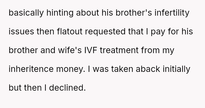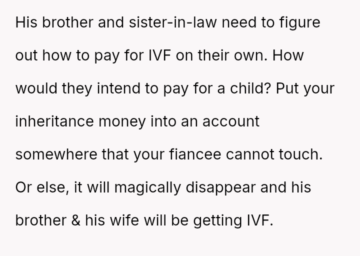 The central issue is the fiancé's insistent demand that the inheritance be used for his brother's IVF treatments, directly contradicting the OP's right to manage their personal funds and their emotional need to honor their mother's memory privately.