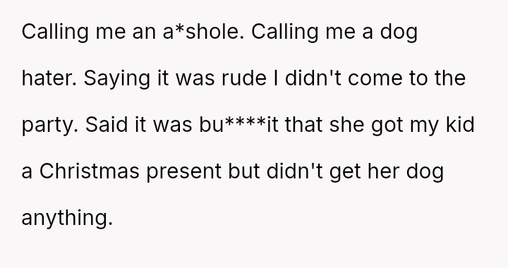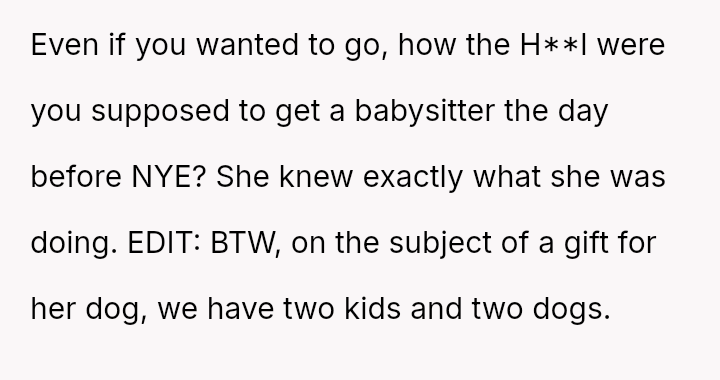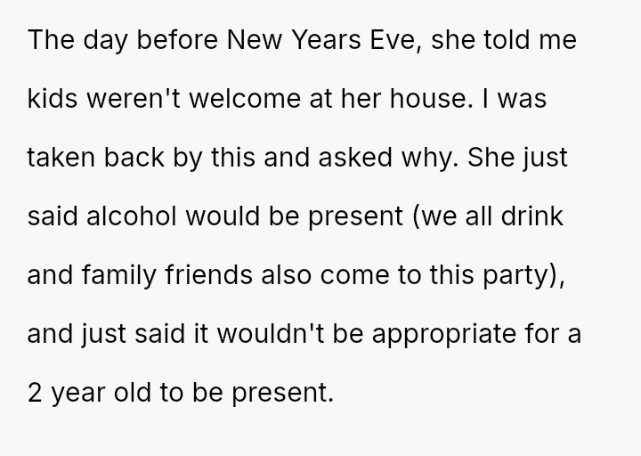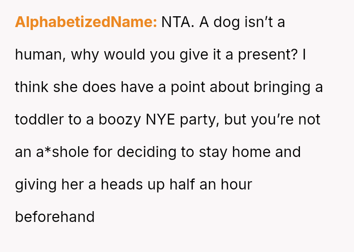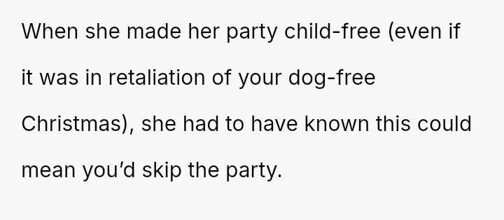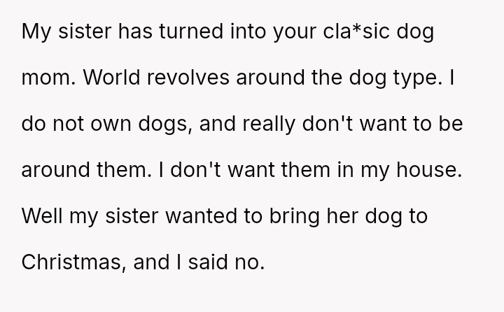 The OP a*serted their boundary against having a dog in their home for Christmas, and subsequently chose not to attend their sister's New Year's Eve party after the sister excluded the OP's two-year-old child.