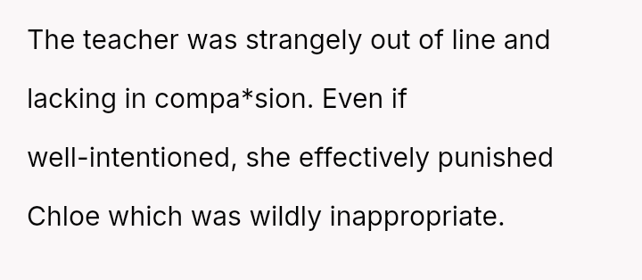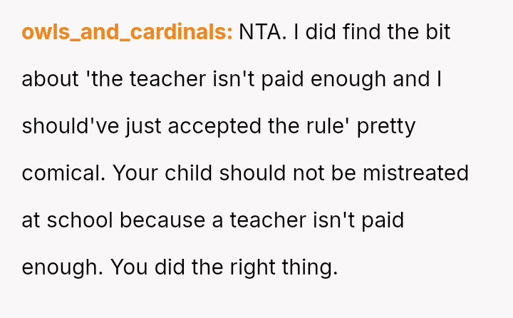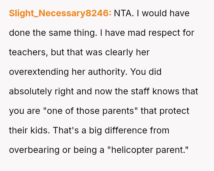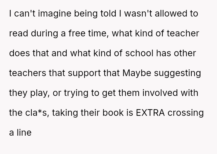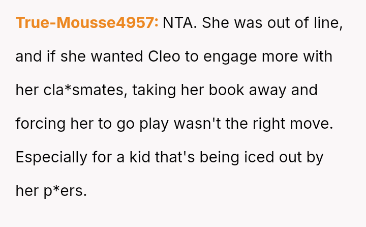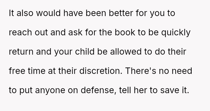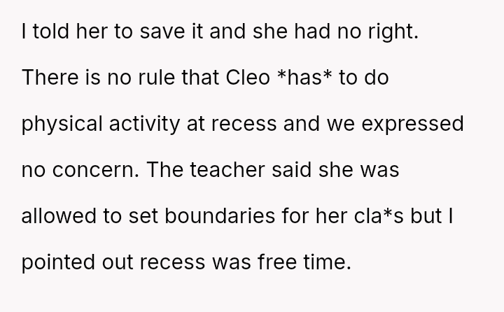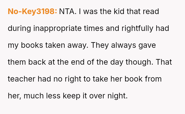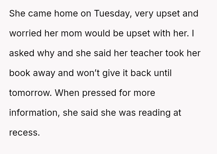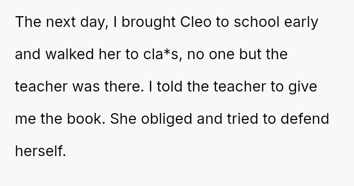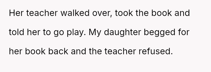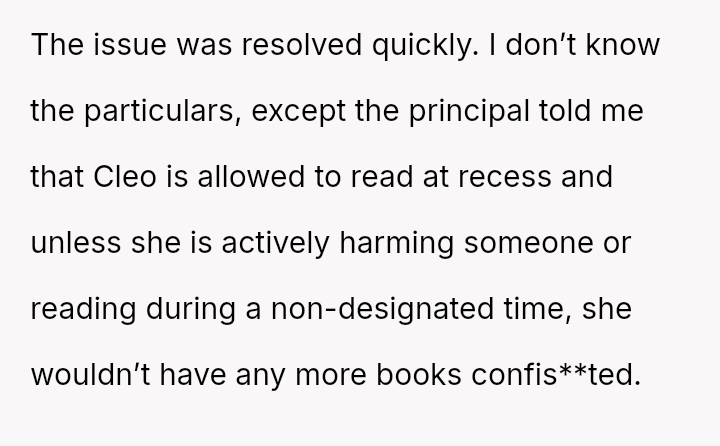 The original poster (OP) acted decisively to defend their daughter, Cleo, after her personal property (a cherished book) was confis**ted by her teacher for reading during recess.