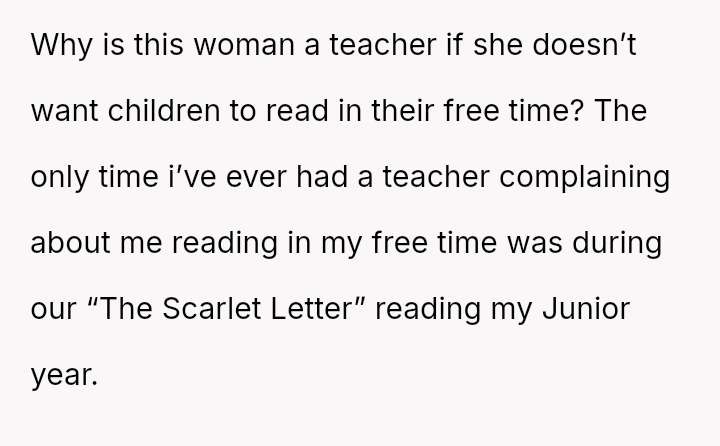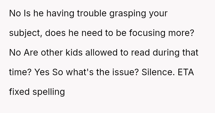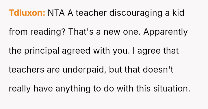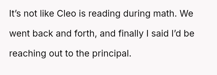 Given that the principal ultimately sided with the OP, validating Cleo's right to read during free time, was the OP justified in escalating the issue directly to the teacher and then the principal, or did this approach unfairly target the teacher and create unnecessary conflict so close to the end of the school year?