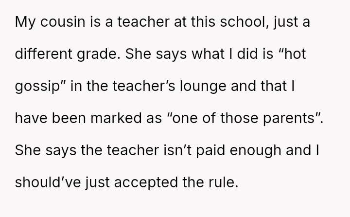 The central conflict lies between the parent's belief in supporting the child's autonomy and personal interest, even if it means defying a unilateral cla*sroom rule, versus the teacher's perceived need to enforce standards of conduct, which the OP's cousin suggested should be accepted due to professional pressures and the short time remaining in the school year.