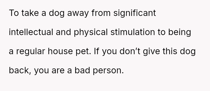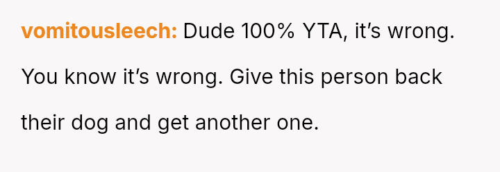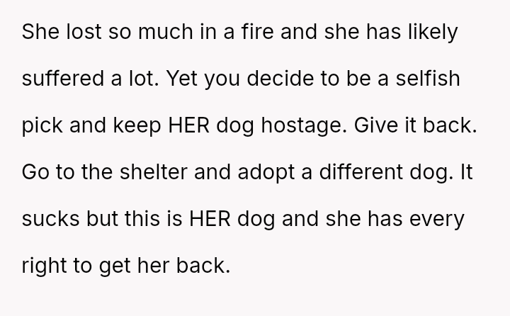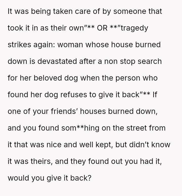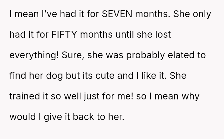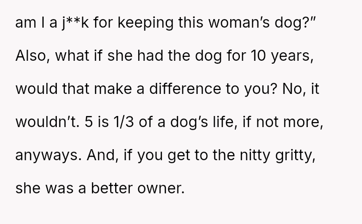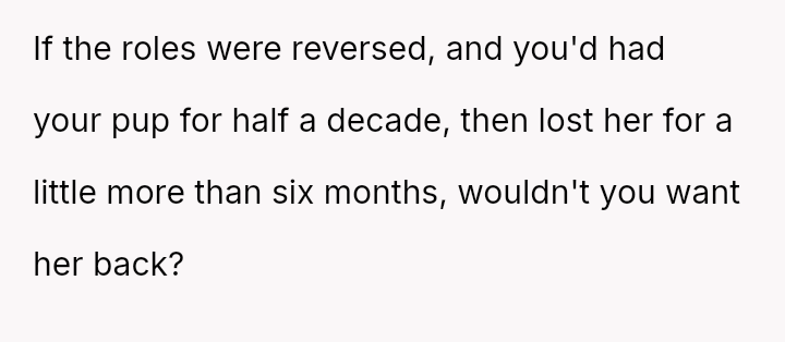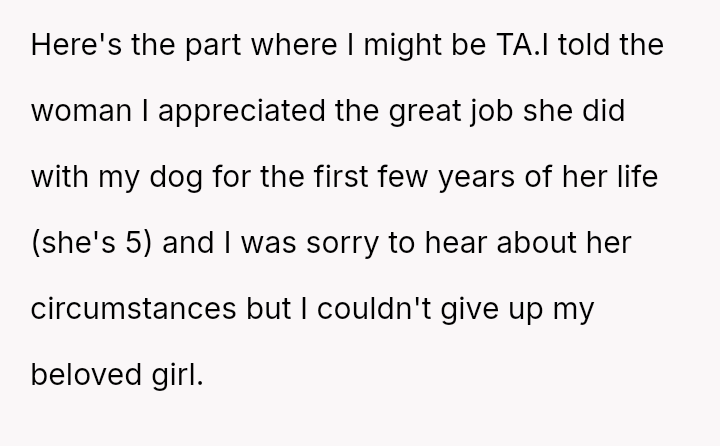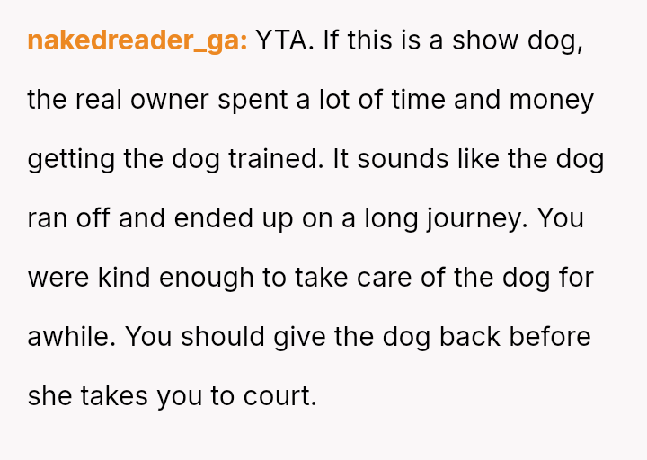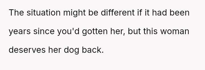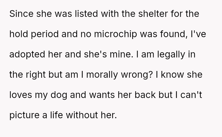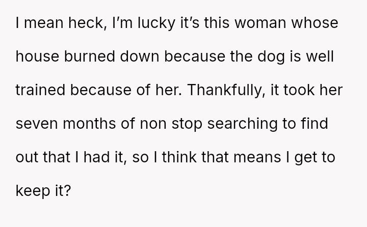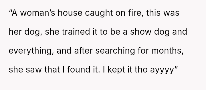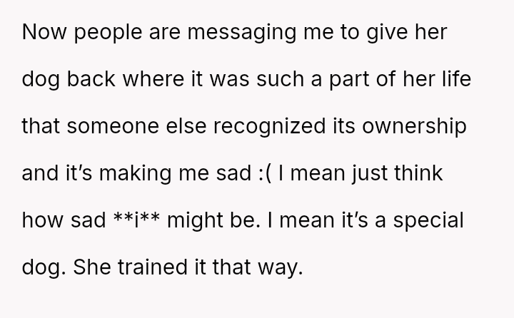 Given that the OP is legally in the clear but morally conflicted over the original owner's clear distress and prior ownership, is it justifiable to prioritize personal mental health and es**blished bond over returning a beloved, high-value show dog to its original, grieving owner?