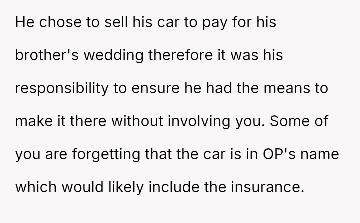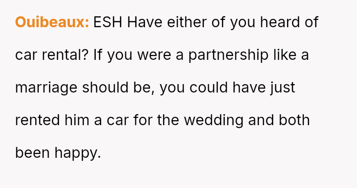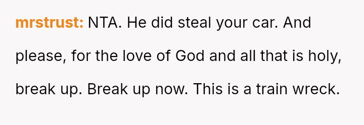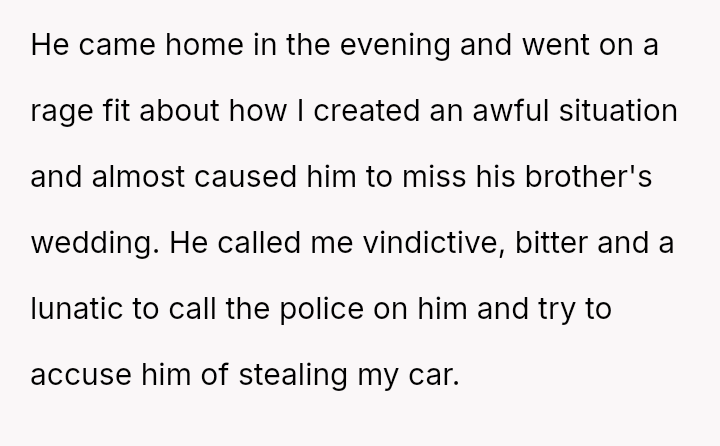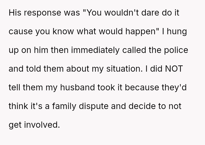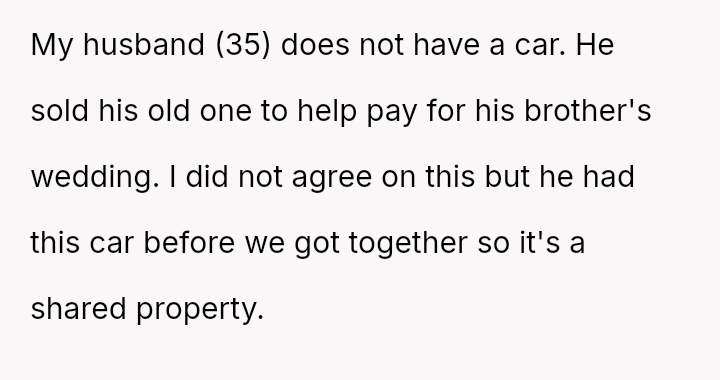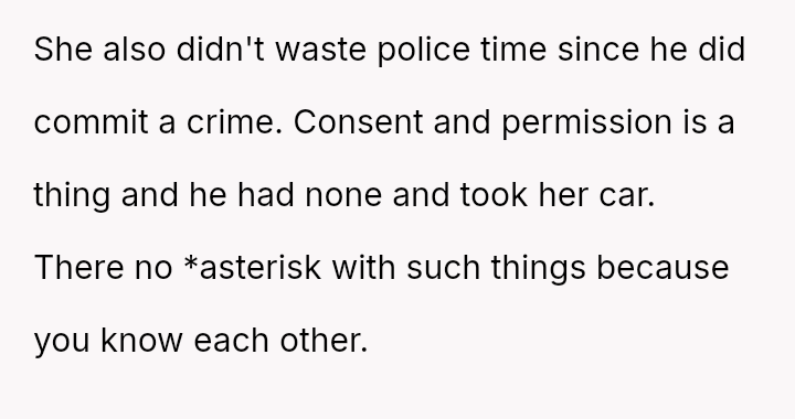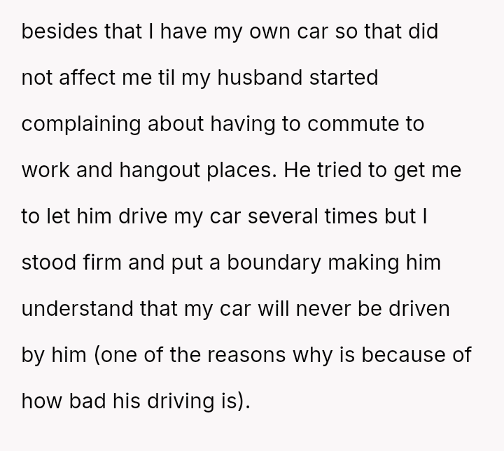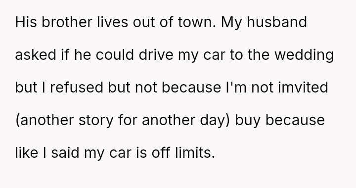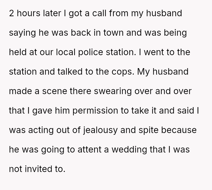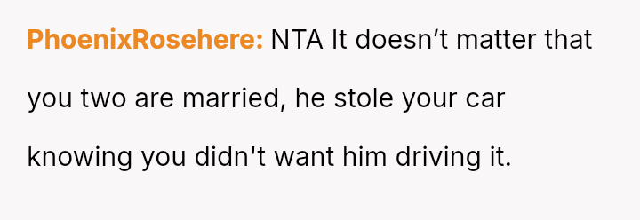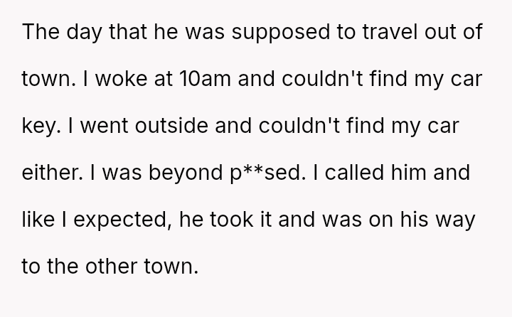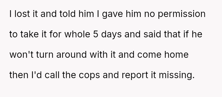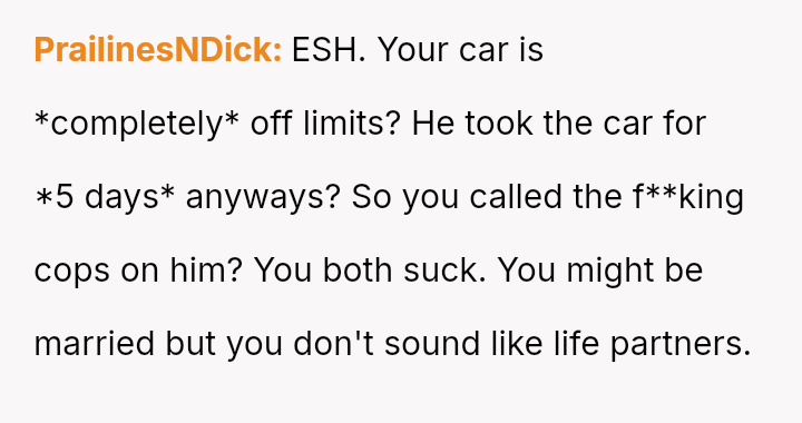 The original poster es**blished a clear boundary regarding the use of her car, yet her husband v***ated this boundary by taking the vehicle without permission for an extended trip, leading to a severe escalation when she reported the car as missing.