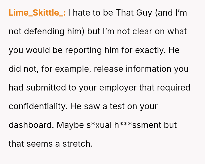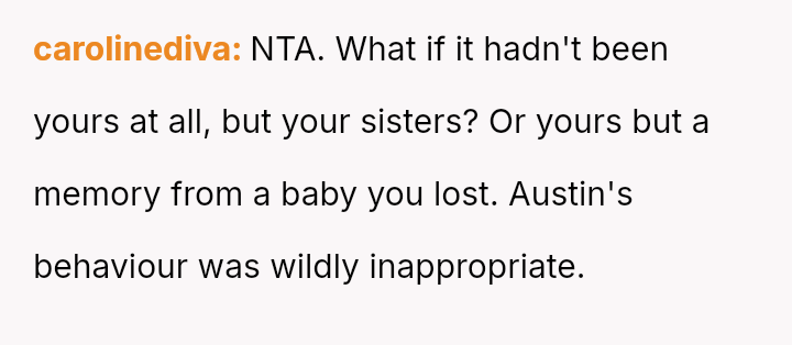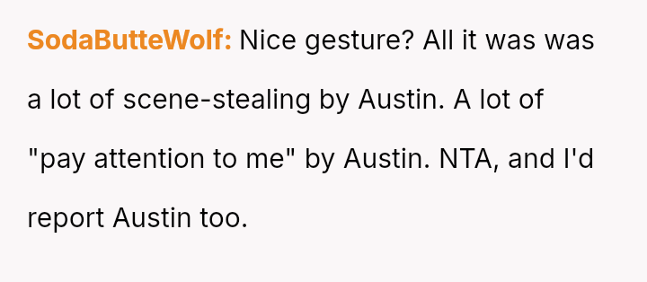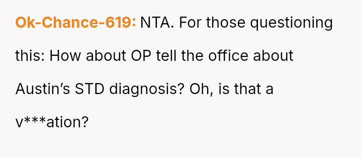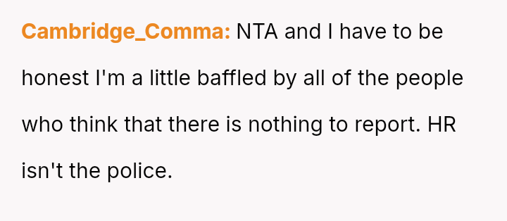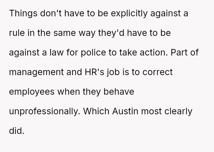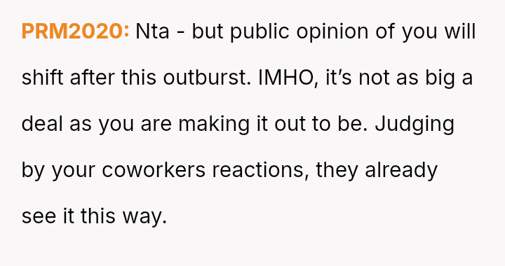 The OP reacted with anger, a*serting her right to privacy, while several coworkers minimized her reaction, framing Austin's action as a well-intentioned gesture.