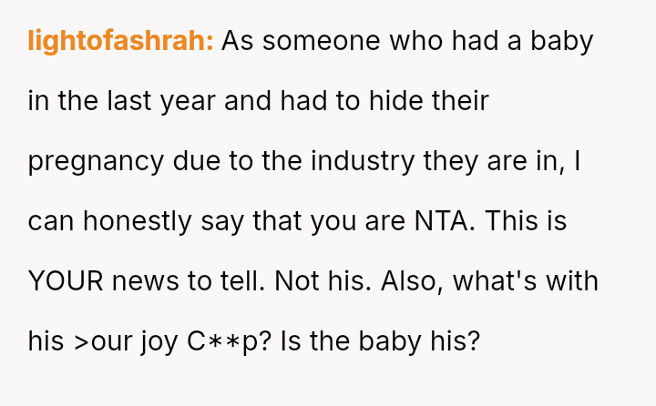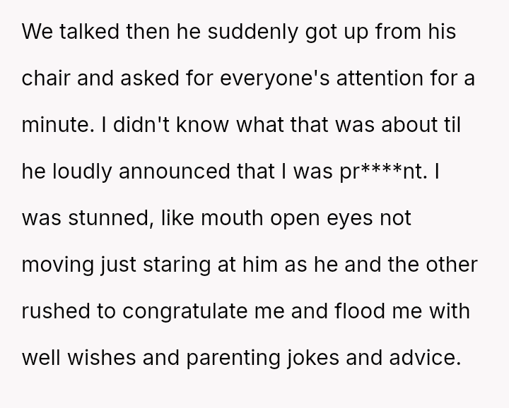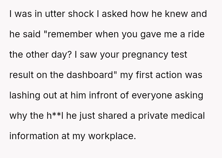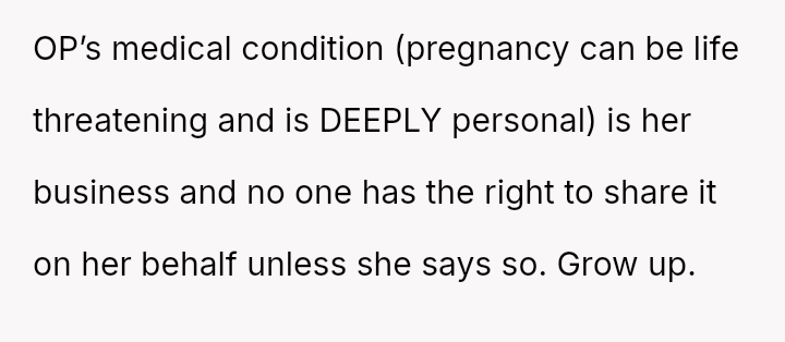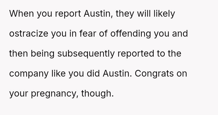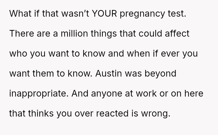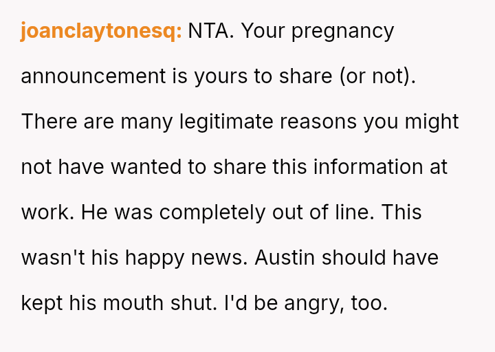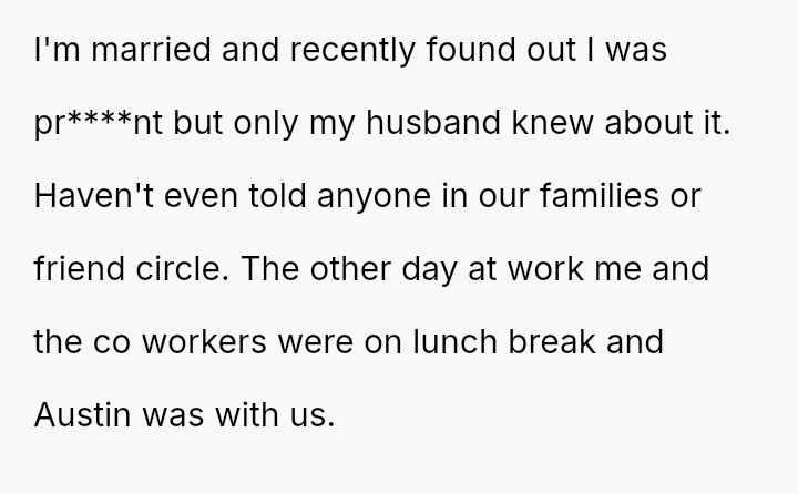 The original poster (OP) is facing a conflict between her deeply personal decision to keep her pregnancy private and her coworker Austin's decision to publicly announce the news based on information he obtained during a private interaction.
