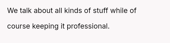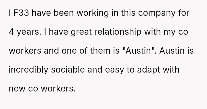 After four years of building trust and camaraderie at her workplace, she finally felt secure in her relationships with her coworkers, especially Austin, the friendly and adaptable colleague who always brought lightness to their conversations.