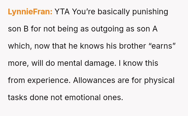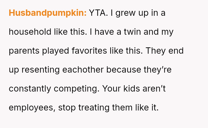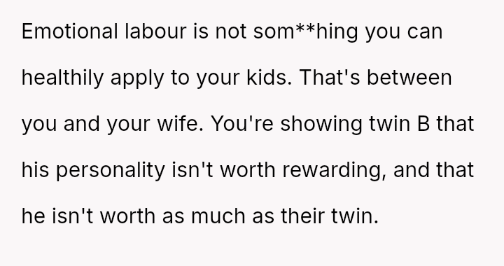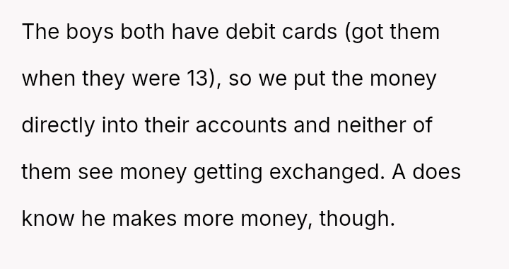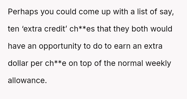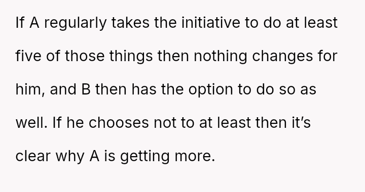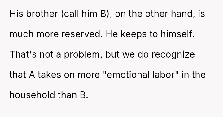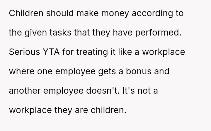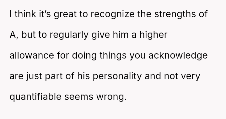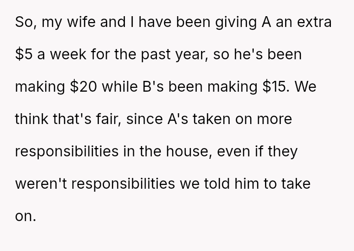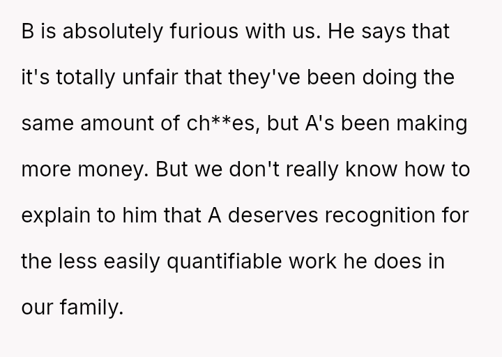 The parents believe A deserves extra compensation for una*signed but valuable emotional labor and leadership within the family, creating a direct clash between objective task completion and subjective contributions.