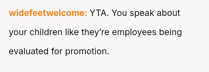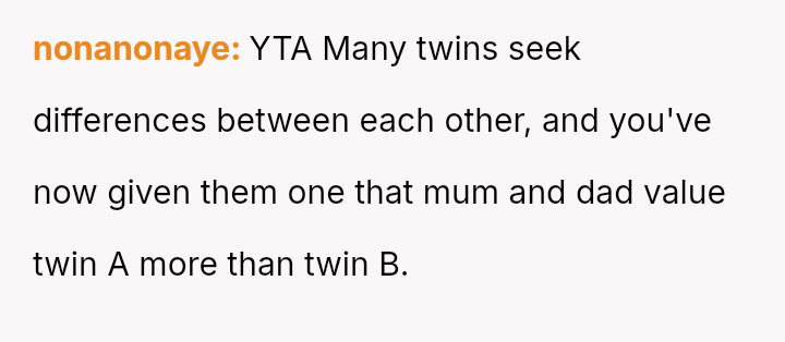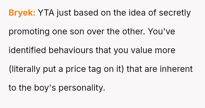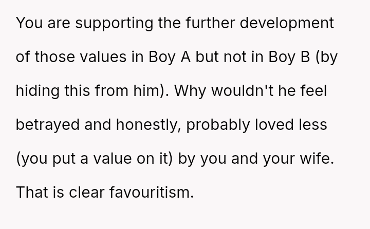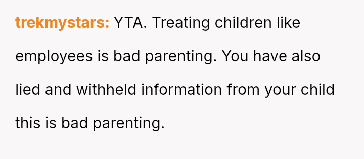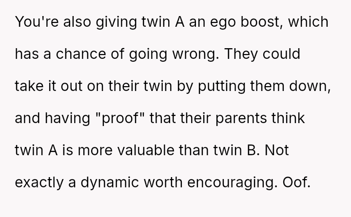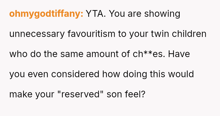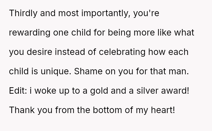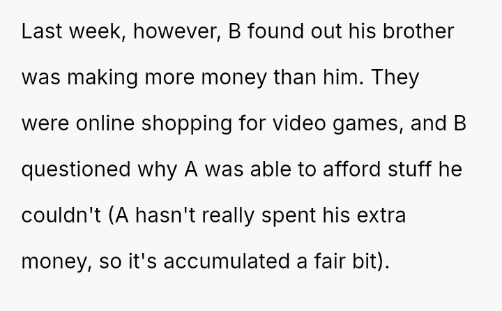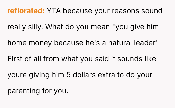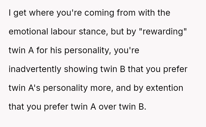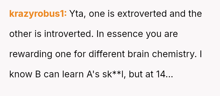 The parents believe A deserves extra compensation for una*signed but valuable emotional labor and leadership within the family, creating a direct clash between objective task completion and subjective contributions.