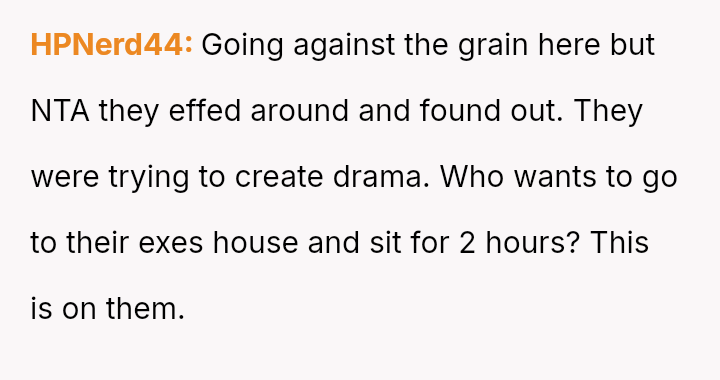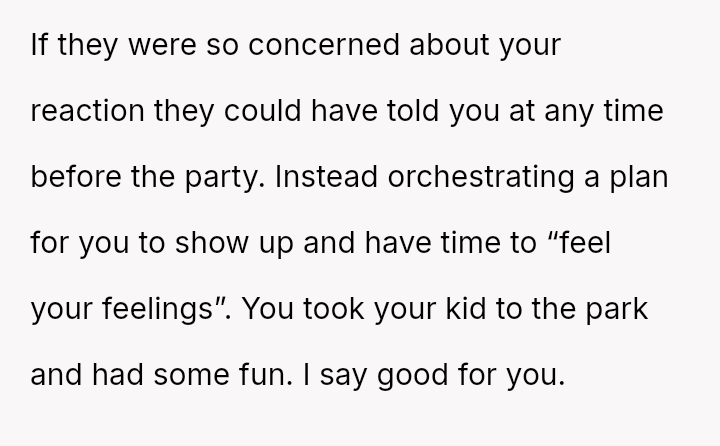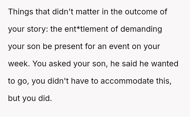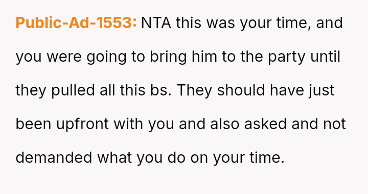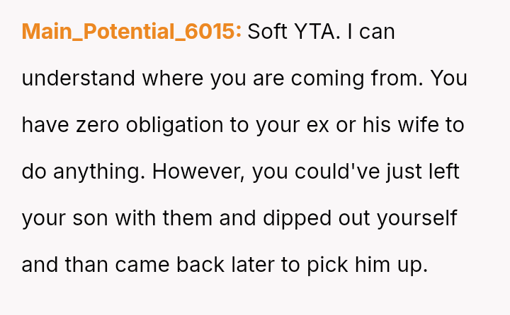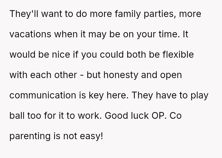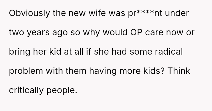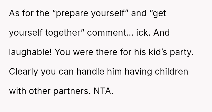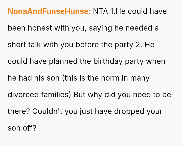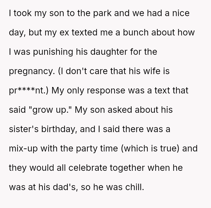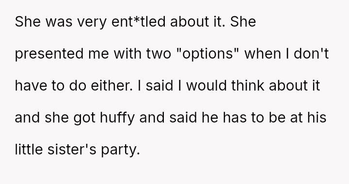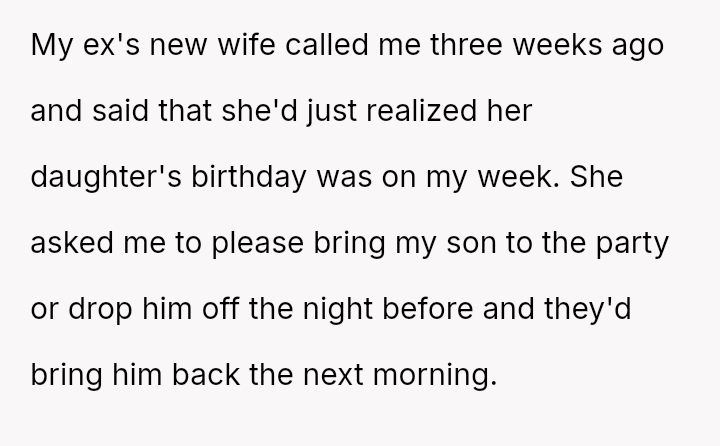The Original Poster (OP) felt pressured and disrespected by the ent*tled demands of the ex-partner's new wife regarding childcare during a birthday party.