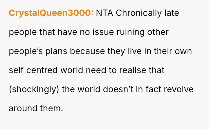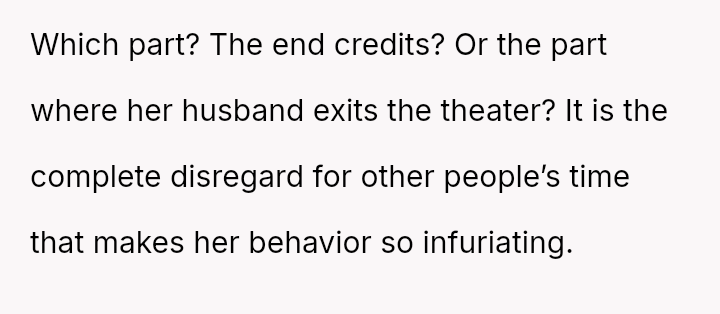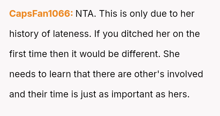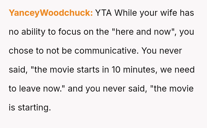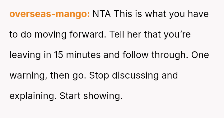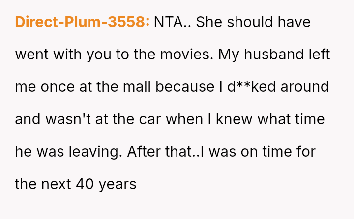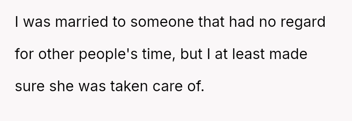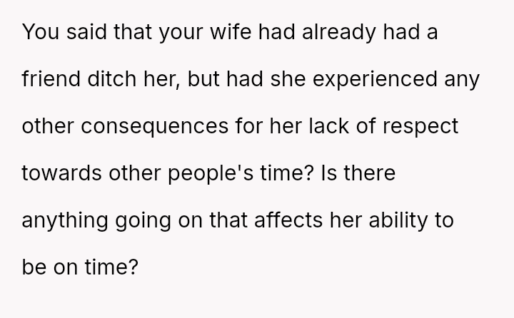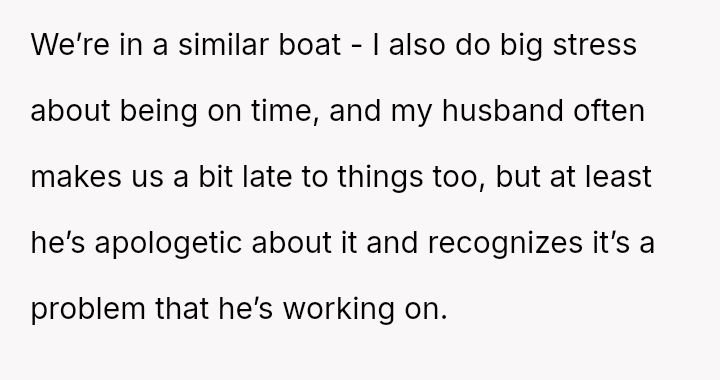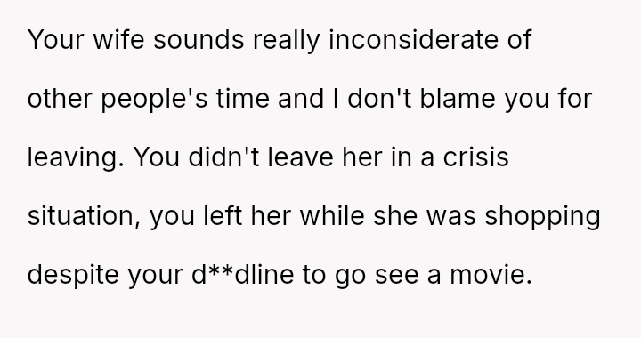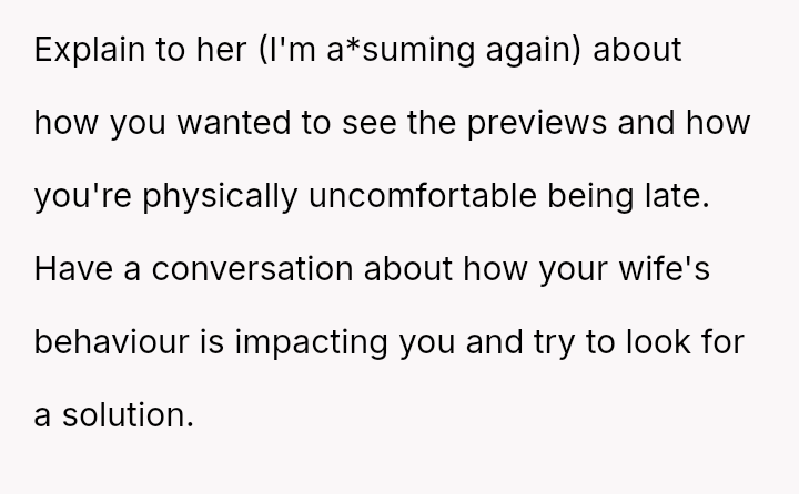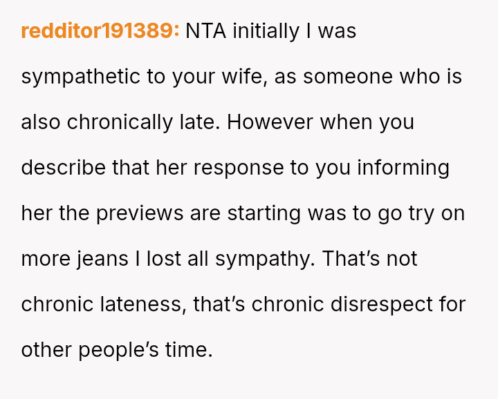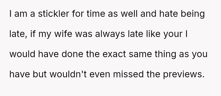 Was the husband justified in abandoning his wife at the theater as a form of 'tough love' to address her chronic lateness, or did this extreme reaction cause unnecessary emotional damage to the marriage by prioritizing his schedule over her feelings in that moment?