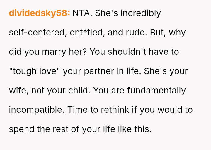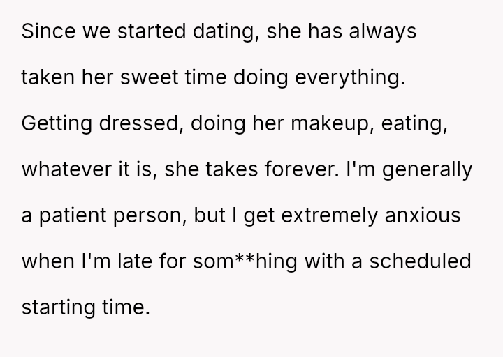 The core conflict lies between the husband's need for punctuality and respect for schedules, which he sees as non-negotiable, and the wife's apparently ingrained habit of taking excessive time for preparation, leading to a breakdown in mutual consideration.