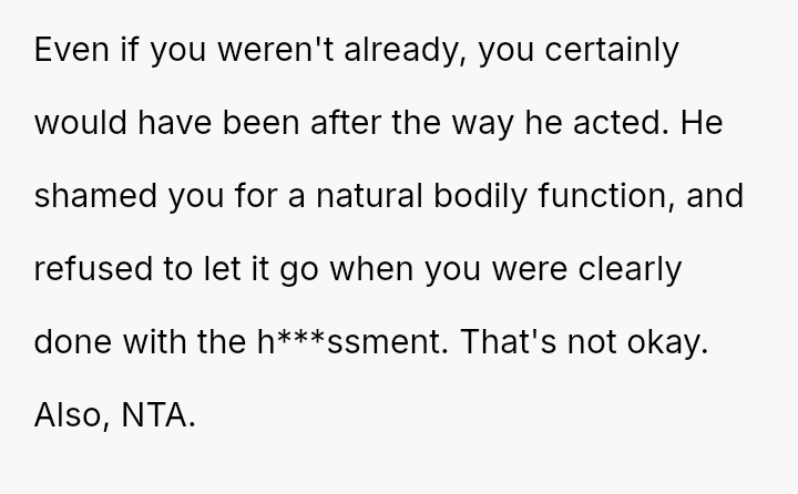 The original poster (OP) is distressed because her boyfriend reacted to a normal bodily function with extreme anger, name-calling, and yelling, leading to a conflict over his aggressive reaction rather than the initial incident itself.