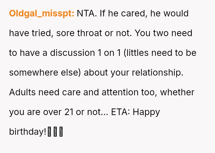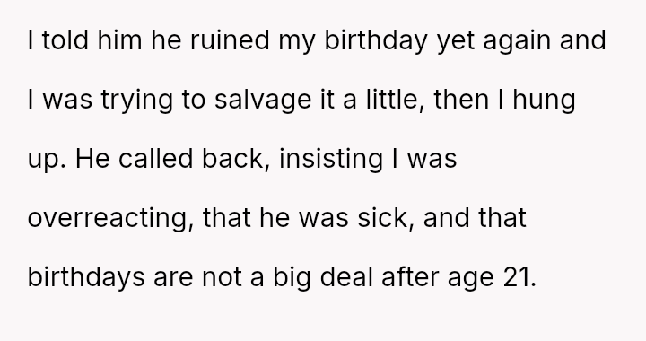 Was the OP justified in leaving the house to salvage her birthday when her partner failed to meet her simple requests while claiming illness, or was her reaction an overreaction to an adult's minor birthday?