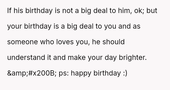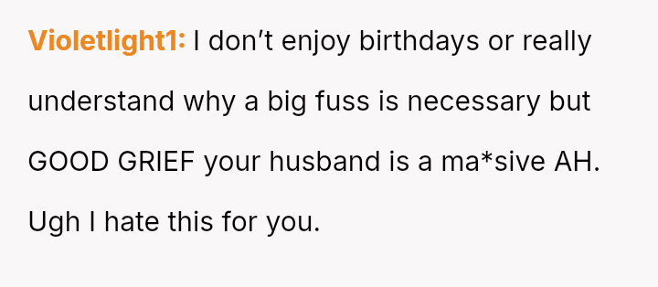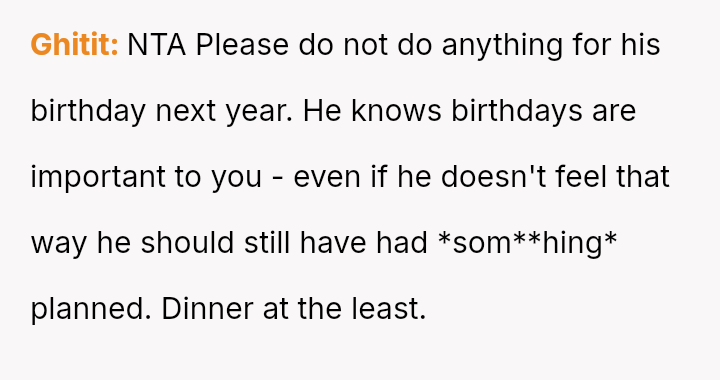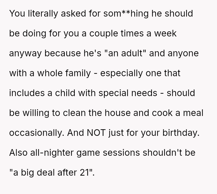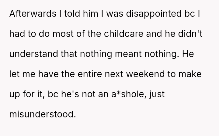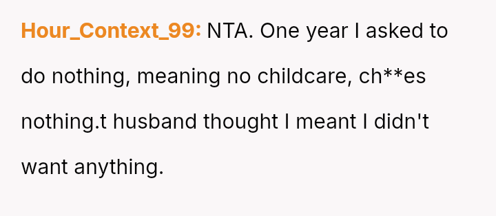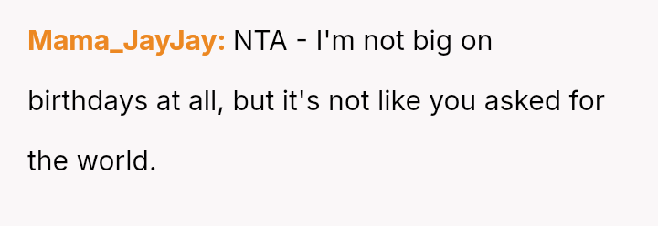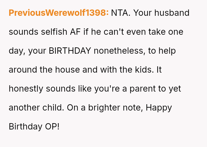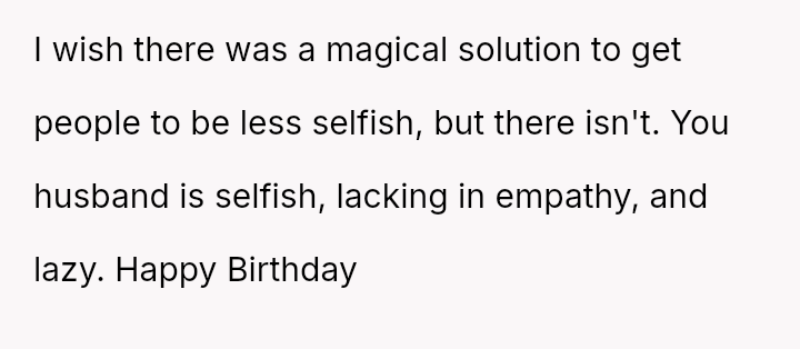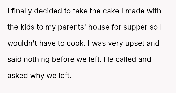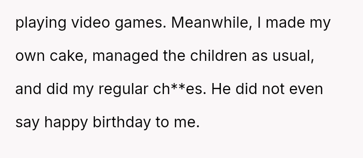 Her request for one day of reciprocity—simple help, rest, and acknowledged celebration—was unmet by her husband, leading her to salvage the day by leaving.