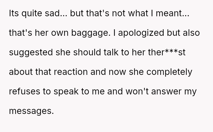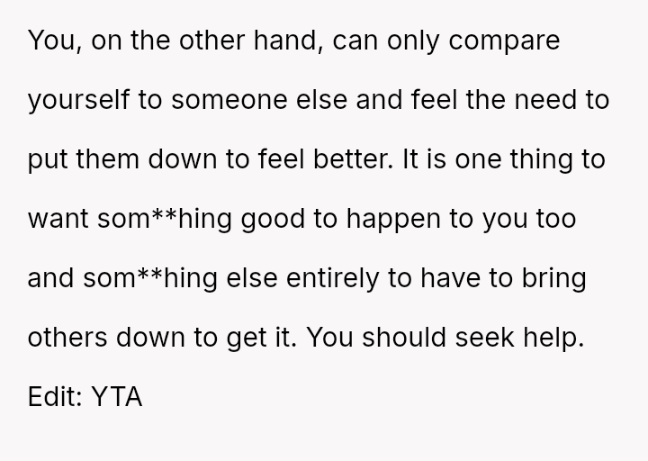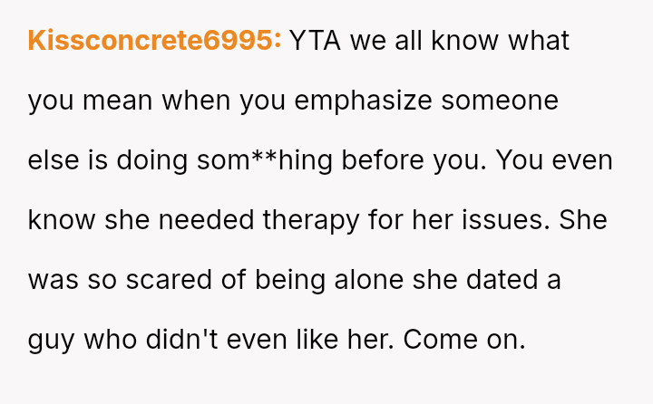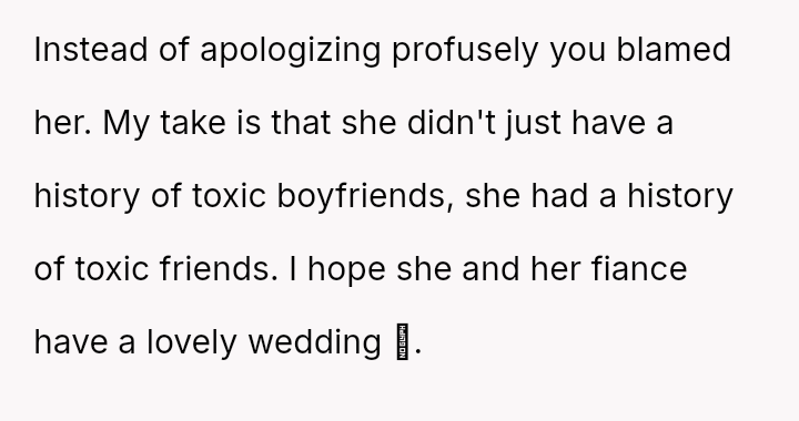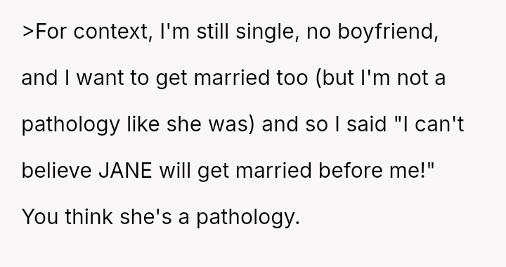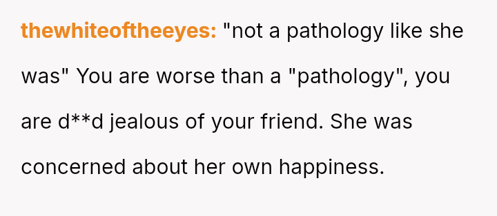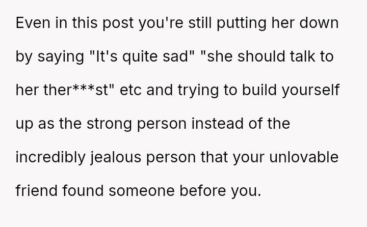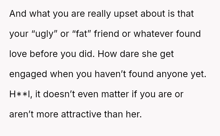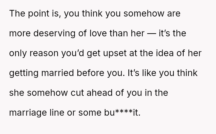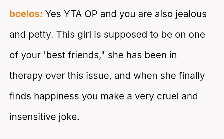 The OP feels their comment about getting married before their friend was misinterpreted, while the friend views it as a painful reminder of past insecurities and self-worth issues, leading to a complete breakdown in communication.