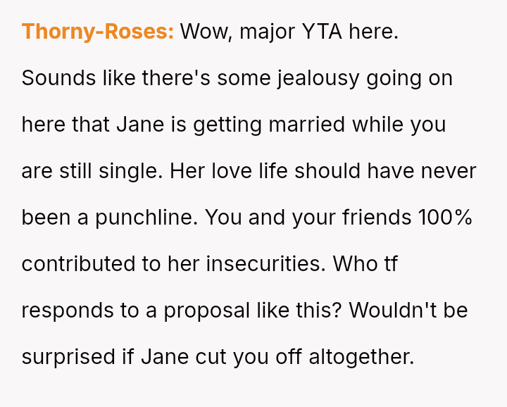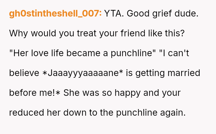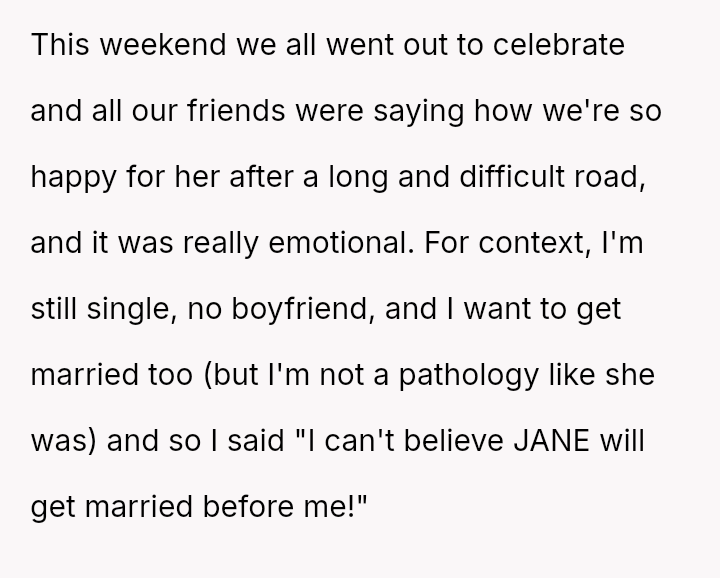Given the history of the friend's insecurity regarding marriage and the OP's acknowledged but seemingly innocent comment, the core question remains: Was the OP's statement an insensitive jab that exploited known vulnerabilities, or was it a justifiable expression of surprise and happiness that the friend reacted disproportionately due to unresolved personal trauma?