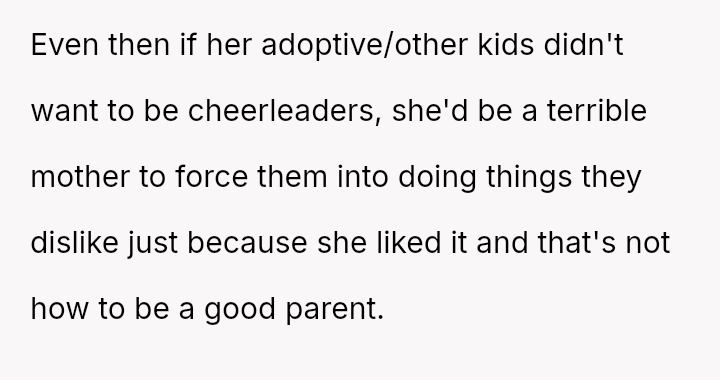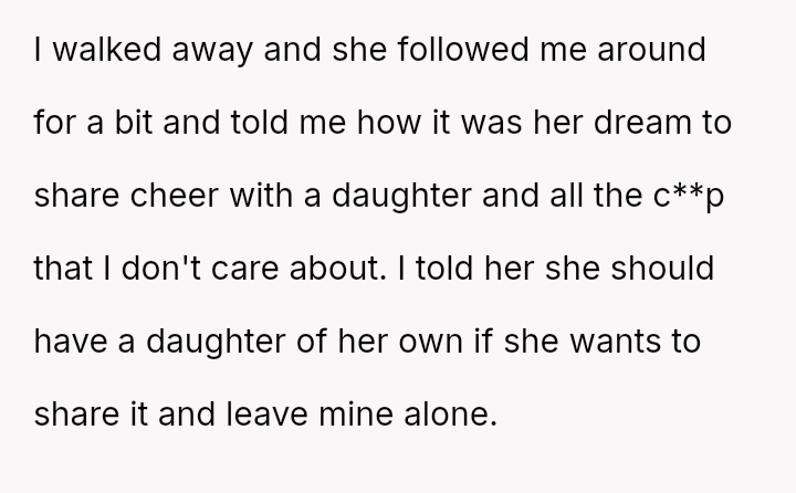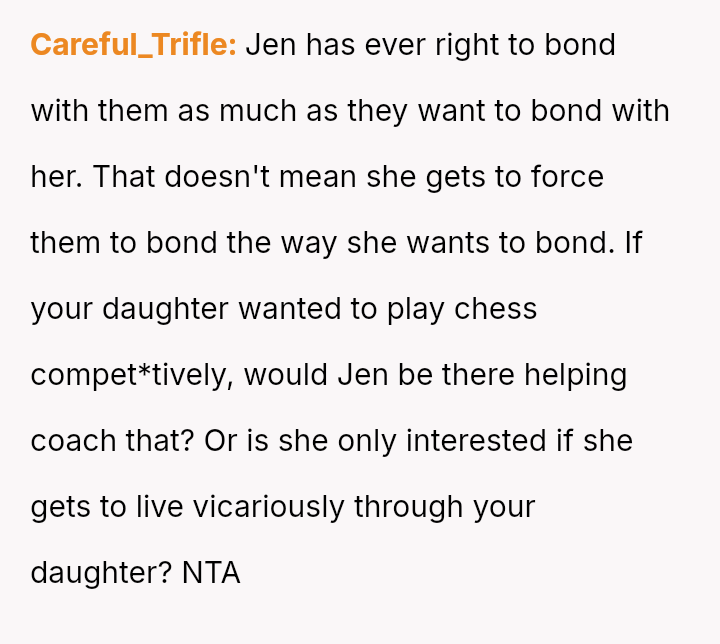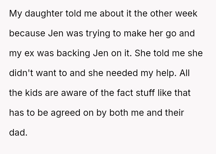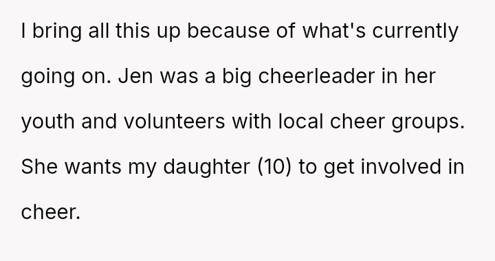 The current conflict centers on Jen's strong desire for the OP's ten-year-old daughter to join a cheerleading group she volunteers with. When the daughter expressed disinterest, the OP intervened to stop the pressure from both the ex and Jen.